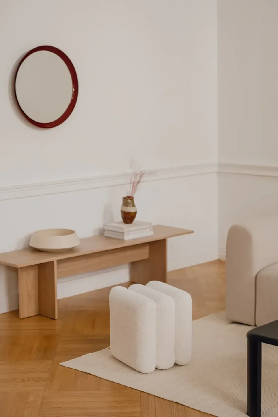 Er eignet sich perfekt als Sitzgelegenheit in der Eingangshalle oder als Teil des Esstischs und schafft mit seinem leichten Ausdruck eine luftige und einladende Atmosphäre. Er kann auch als dekoratives Element im Wohnzimmer dienen, zusammen mit einer stilvollen Decke oder ein paar handverlesenen Büchern. Für ein komplettes Erscheinungsbild lässt sich Hett mit den anderen Möbeln von in den gleichen natürlichen Farbtönen und organischen Materialien kombinieren. Seine Vielseitigkeit macht ihn zu einer funktionalen und ästhetischen Ergänzung für jede Inneneinrichtung.