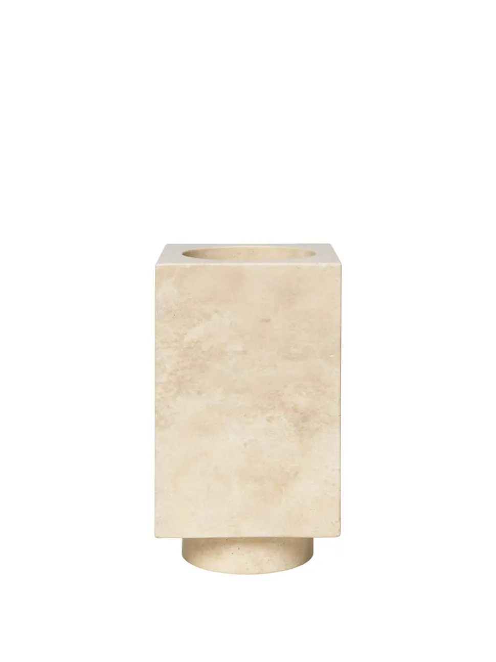 Die Hew Vase von ist eine elegante skulpturale Vase, die natürliche Materialien mit moderner Ästhetik verbindet. Die einzigartige Oberfläche der Vase aus Travertin unterstreicht die organischen Nuancen und Texturen, die nur Naturstein bieten kann. Die geometrische Form schafft ein Gleichgewicht zwischen Rohheit und Raffinesse und macht sie zu einem künstlerischen Element in jeder Einrichtung. Mit ihrer soliden Konstruktion und den weichen Kurven schafft die Hew Vase einen schönen Kontrast zwischen dem Strengen und dem Organischen. Sie eignet sich sowohl für frische Blumen als auch als alleinstehendes Dekorationsobjekt.