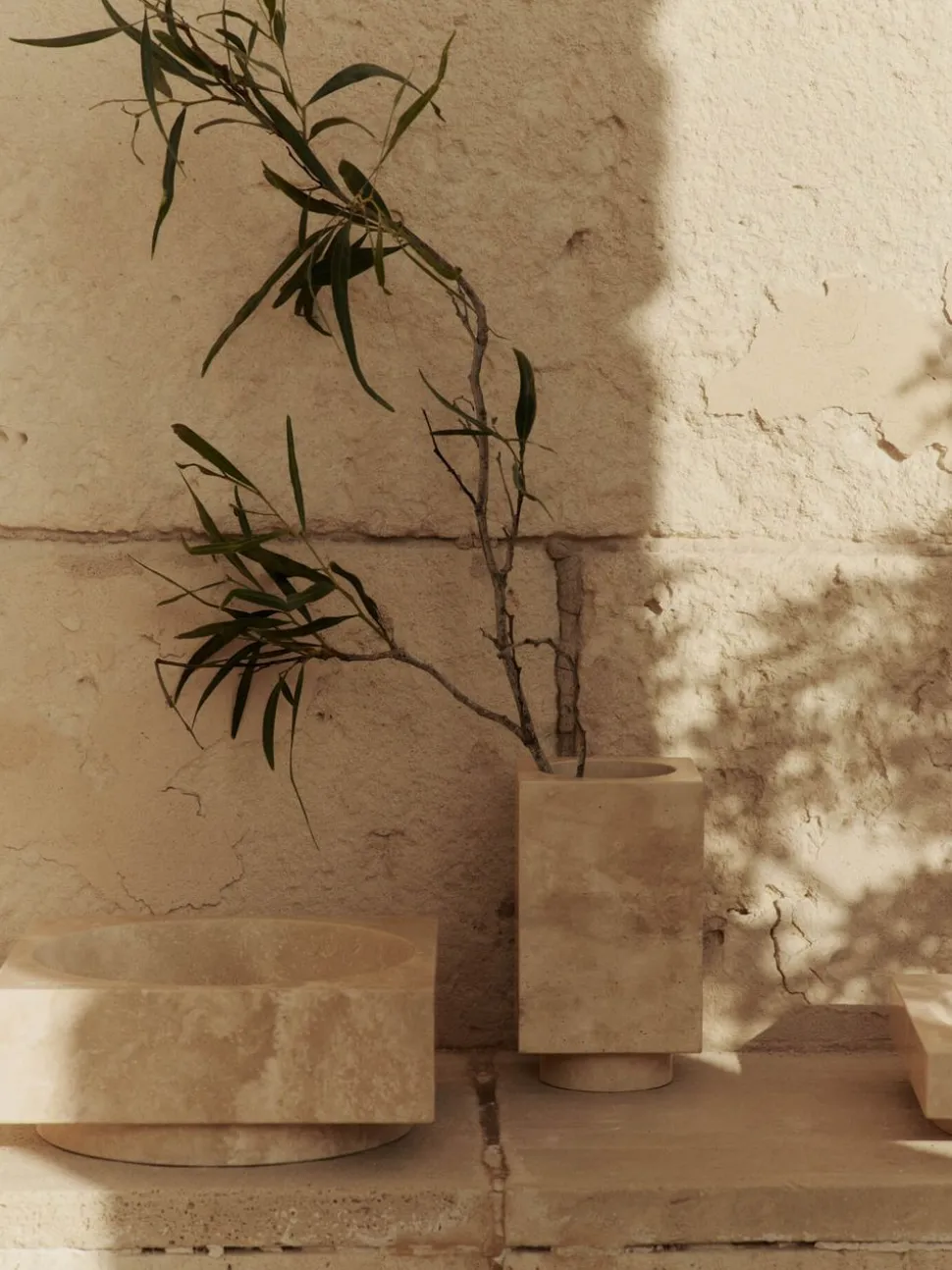 Mit ihrer fühlbaren Oberfläche und den warmen Farbtönen bringt die Hew Vase eine natürliche Ruhe in jeden Raum. Sie kann auf einem Esstisch, einem Bücherregal oder einer Fensterbank platziert werden und verleiht ihm eine raffinierte, erdige Eleganz. Kombinieren Sie sie mit anderen Travertin-Elementen oder Keramikdesigns von , um ein harmonisches Ganzes zu schaffen. Dank seines zeitlosen Aussehens lässt er sich sowohl in moderne als auch in klassische Interieurs integrieren.