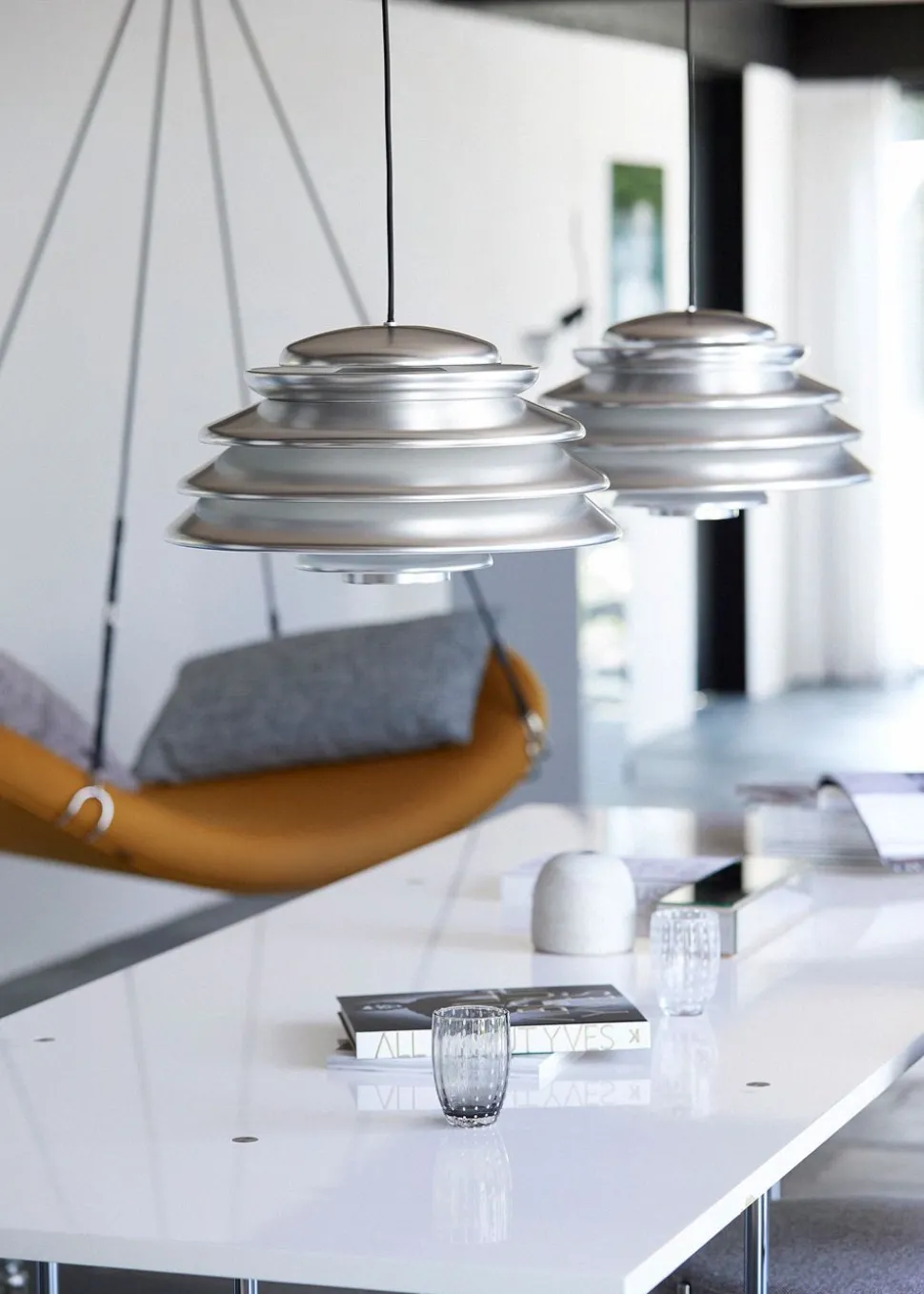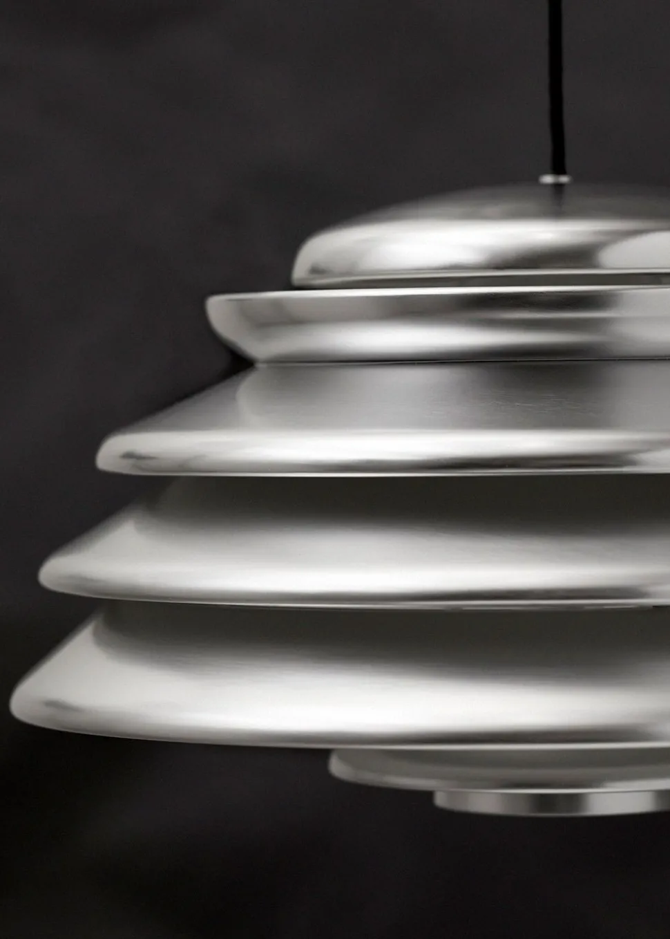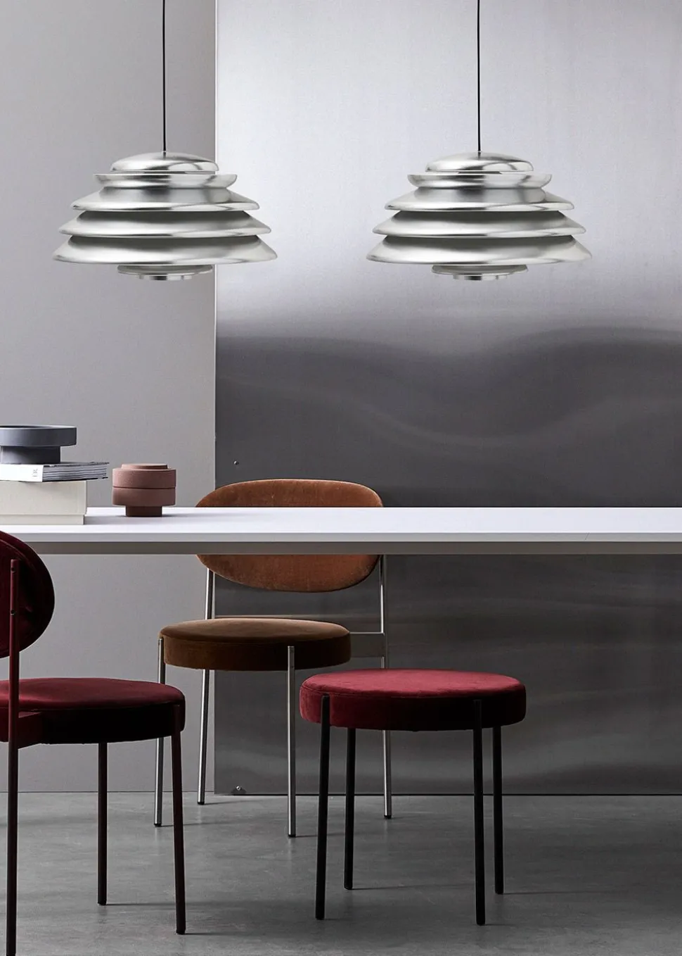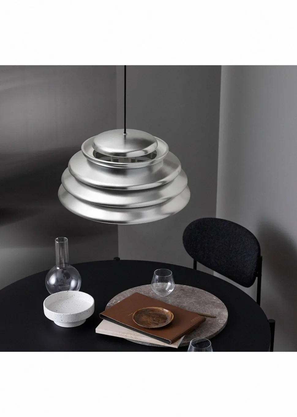 Eine einzigartige Lampe aus luxuriösen Materialien, kombiniert mit einem zeitlosen Design, das der Lampe ein klassisches, aber dennoch modernes Aussehen verleiht. Die einzigartige Struktur mit Schichten von Lampenschirmen trägt dazu bei, das Licht nach unten zu zentrieren und gleichzeitig ein angenehmes Licht zu erzeugen, das sich perfekt für den Esstisch eignet.