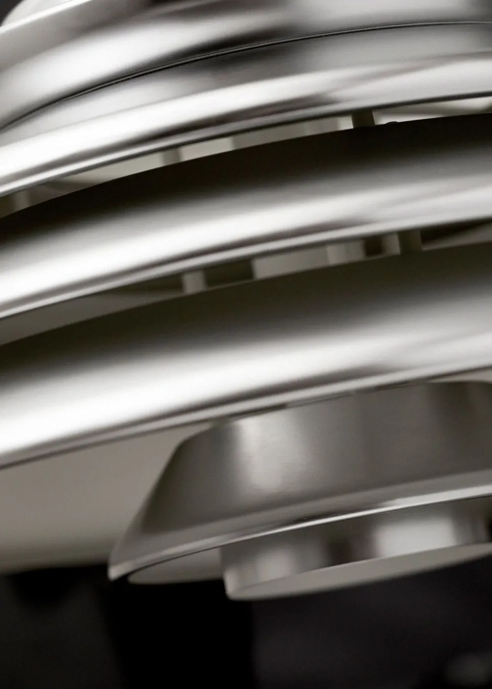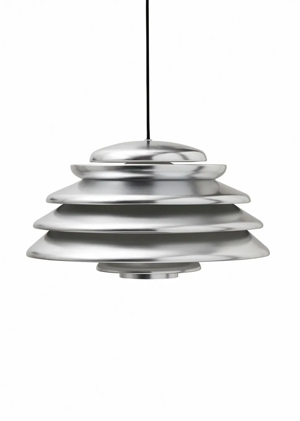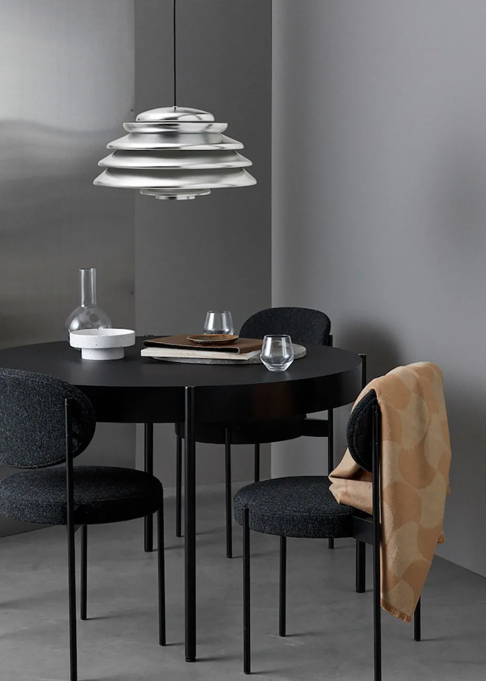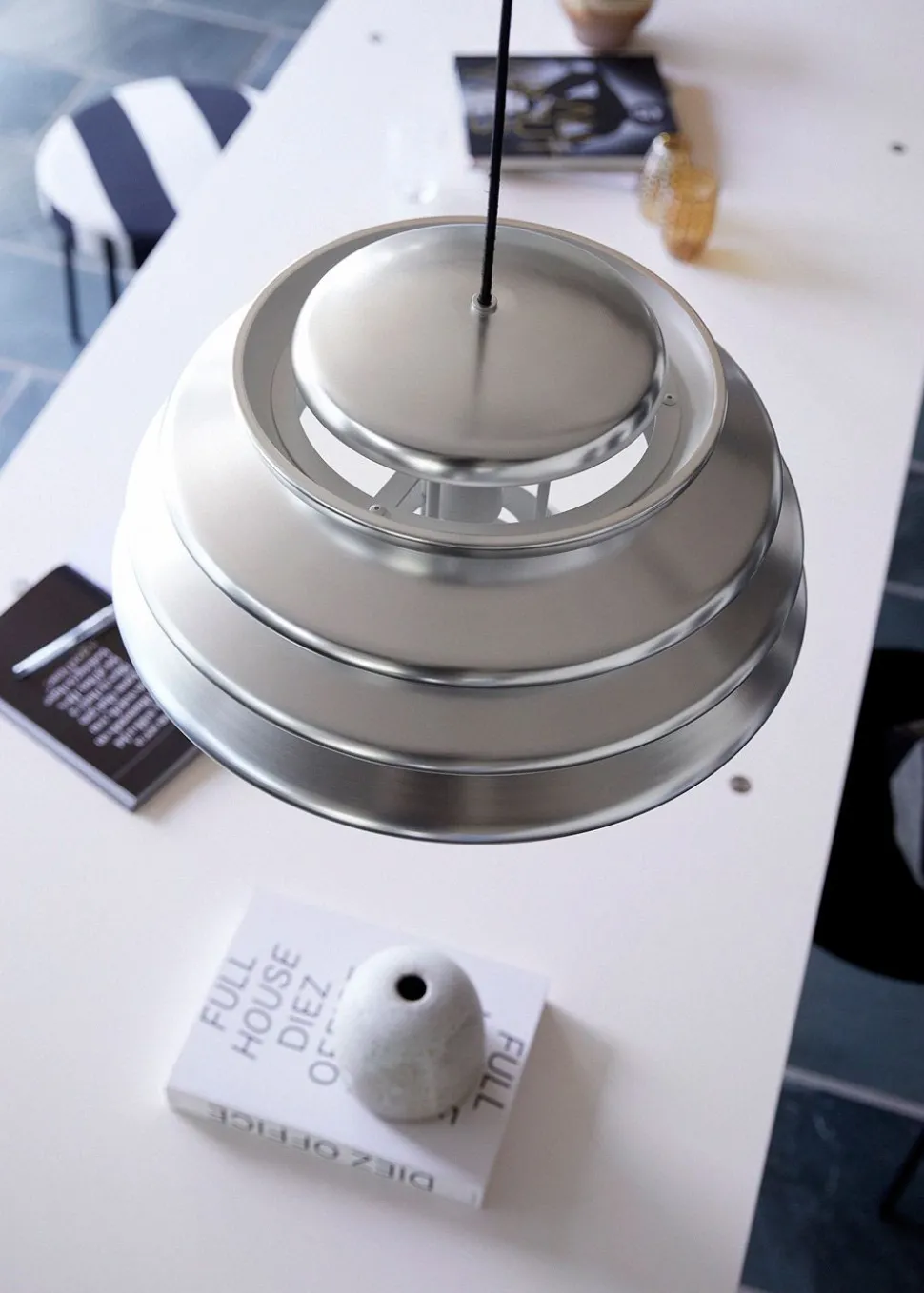 Eine einzigartige Lampe aus luxuriösen Materialien, kombiniert mit einem zeitlosen Design, das der Lampe ein klassisches, aber dennoch modernes Aussehen verleiht. Die einzigartige Struktur mit Schichten von Lampenschirmen trägt dazu bei, das Licht nach unten zu zentrieren und gleichzeitig ein angenehmes Licht zu erzeugen, das sich perfekt für den Esstisch eignet.