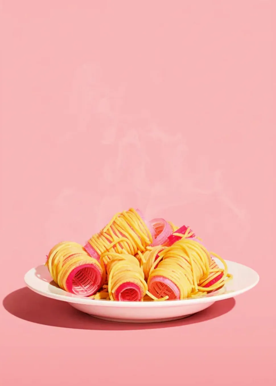 Warme Spaghetti um Kringel herum, auf einem Teller mit einem knallrosa Hintergrund.