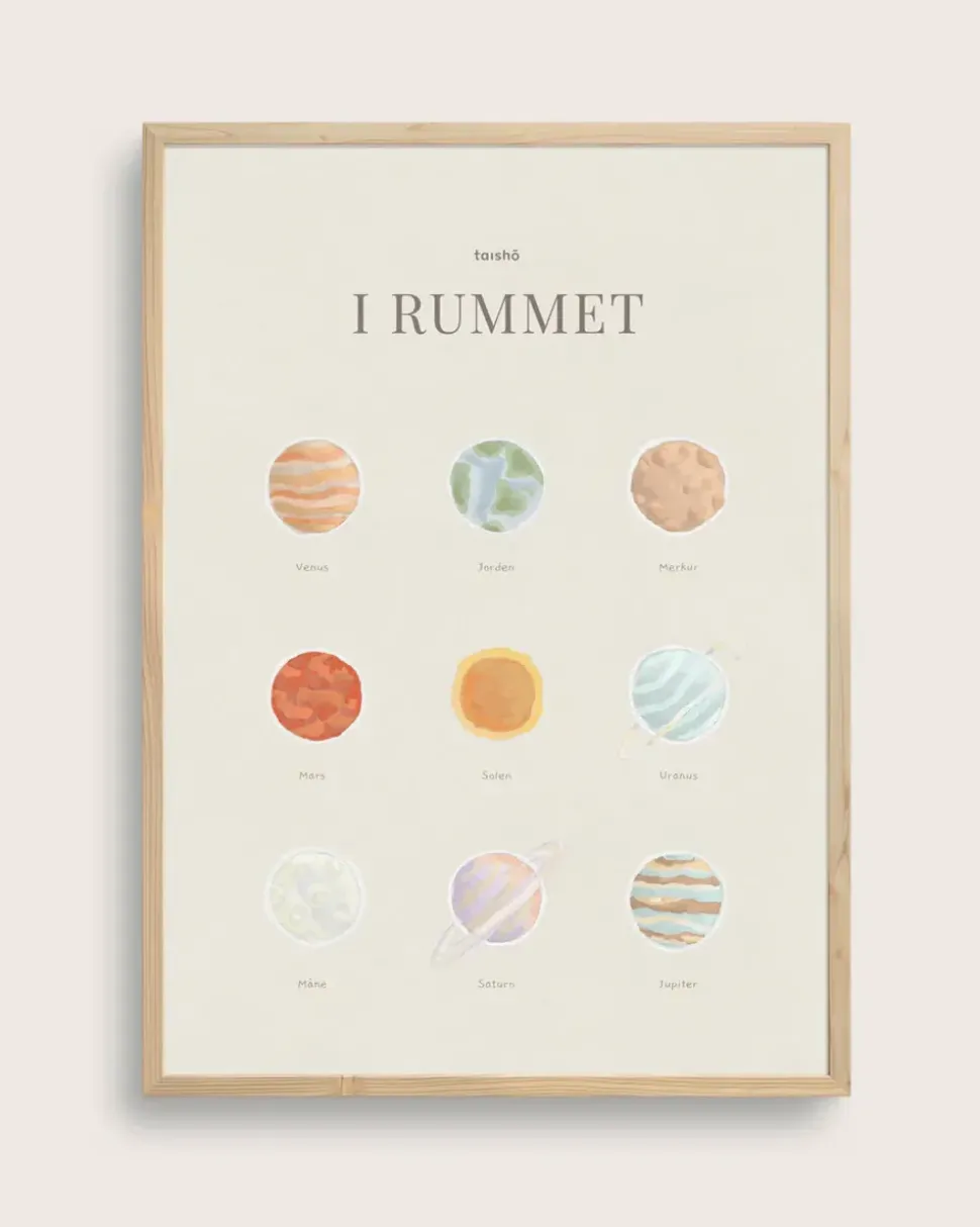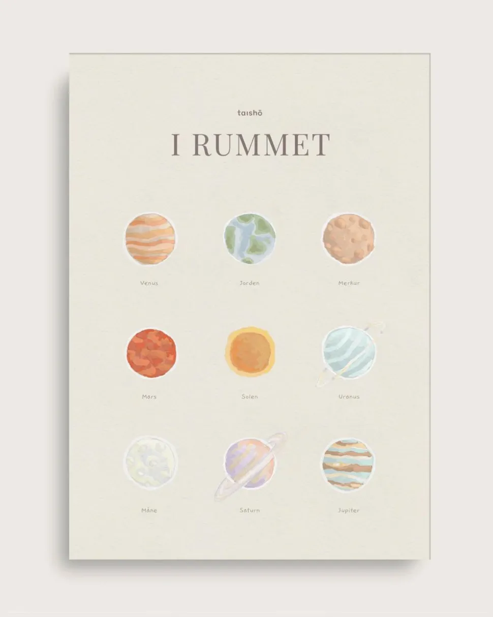Auf dem Kinderposter „Im Weltraum“ sind 9 verschiedene Planeten abgebildet, unter denen die Namen stehen. Die einzigartigen Designs und die schönen Farben der Planeten machen das Poster zu einem dekorativen Hingucker an den Wänden des Kinderzimmers.