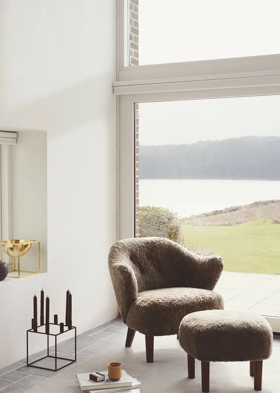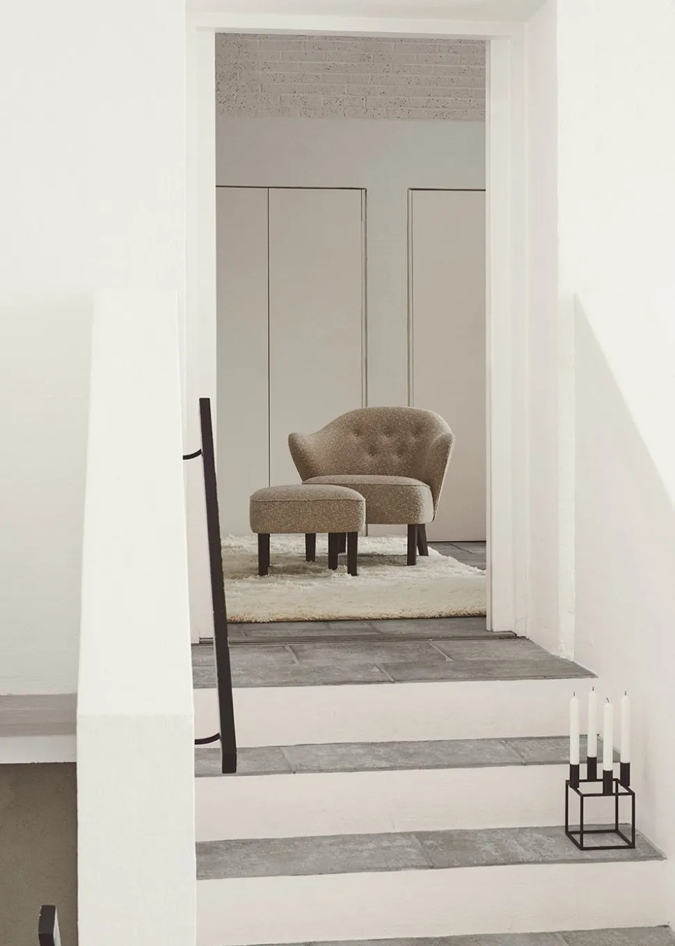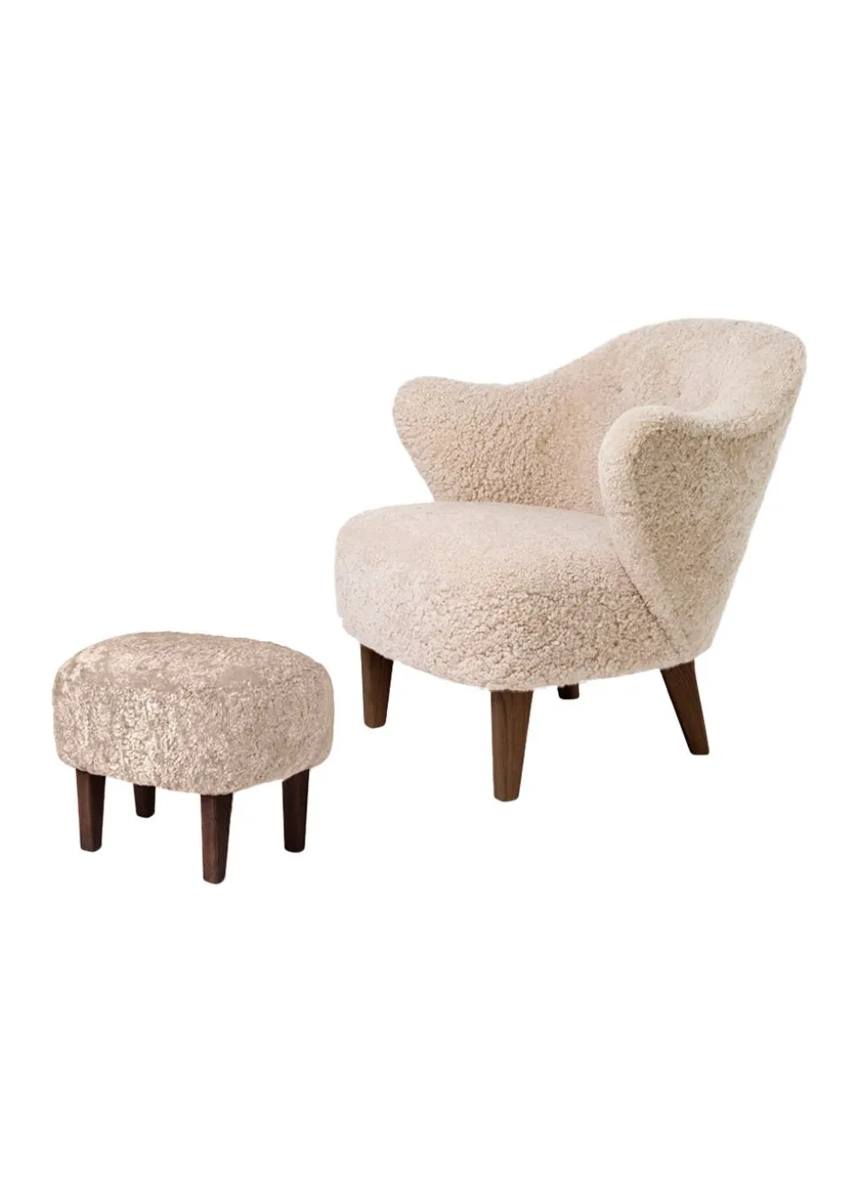 Ingeborg mit Hocker von . Ingeborg wurde ursprünglich 1940 von Flemming Lassen entworfen. Der charmante kleine Stuhl ist nach Flemmings und Mogens Lassens Mutter, der Künstlerin Ingeborg Winding, benannt. Trotz ihrer geringen Größe erhellt Ingeborg jeden Raum mit ihrem Charme und ihrem exklusiven Stil. Der Stuhl ist aus jedem Blickwinkel schön und kann überall im Raum platziert werden, ohne zu viel Platz einzunehmen.