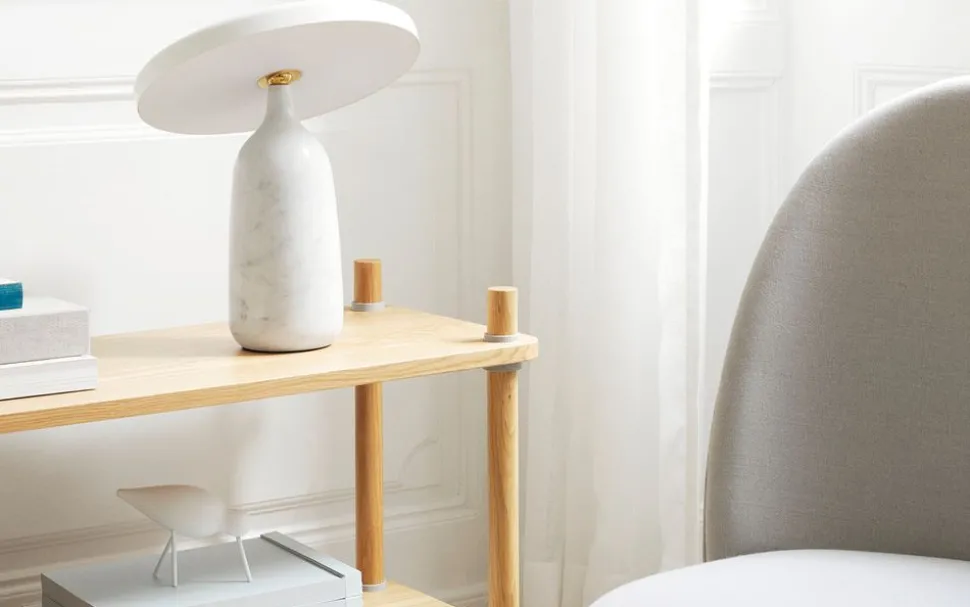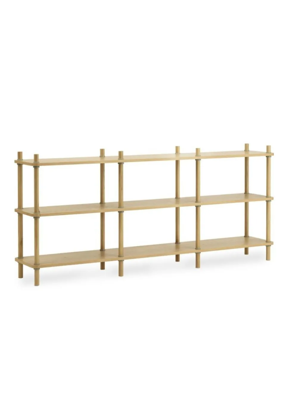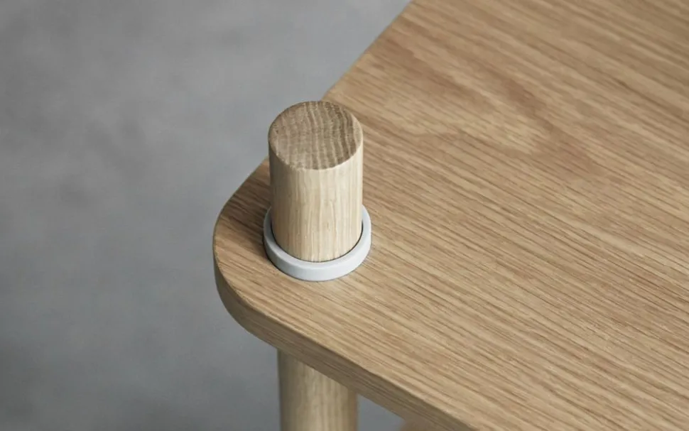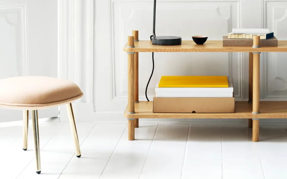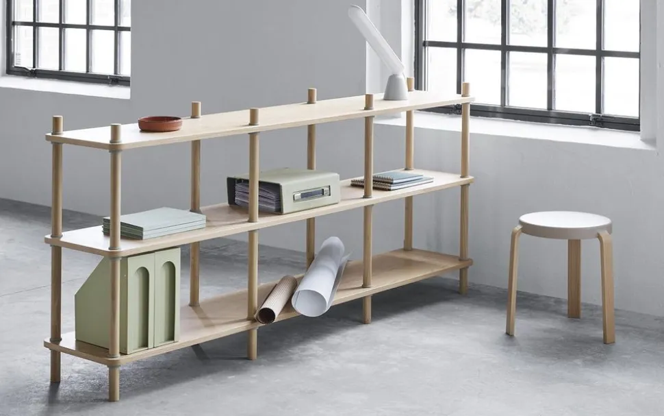 Jam ist ein vielseitiges Bücherregal mit einem cleveren und eleganten Design. Der Keil des Regals ist nicht nur ein ästhetisches Design-Detail, sondern ermöglicht es auch, das Regal ohne Schrauben oder Werkzeug aufzubauen. Stellen Sie das Bücherregal an eine Wand oder verwenden Sie es als Raumteiler im Büro oder im Wohnzimmer.