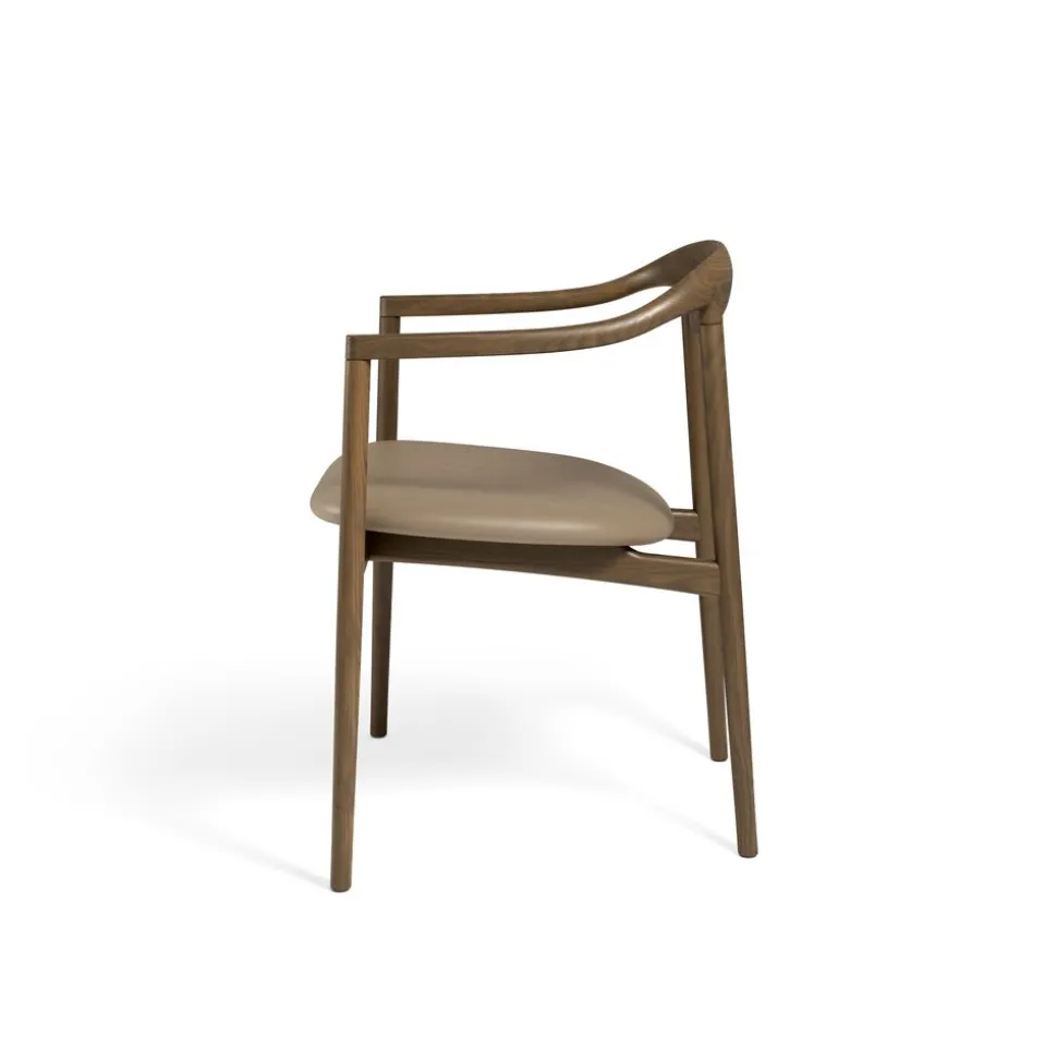 Durch modernes CNC-Fräsen und traditionelle handwerkliche Formgebung und Verarbeitung erhält der Stuhl sein einzigartiges Aussehen. Der Esszimmerstuhl passt perfekt in ein modernes Esszimmer, wo er eine einzigartige Ergänzung der Einrichtung darstellt.