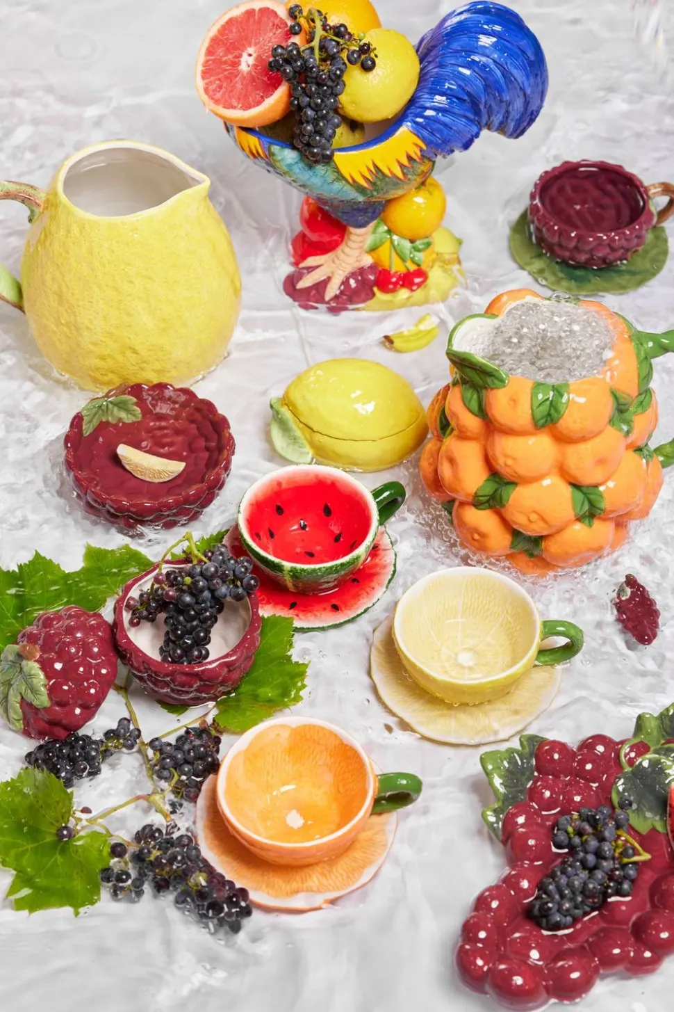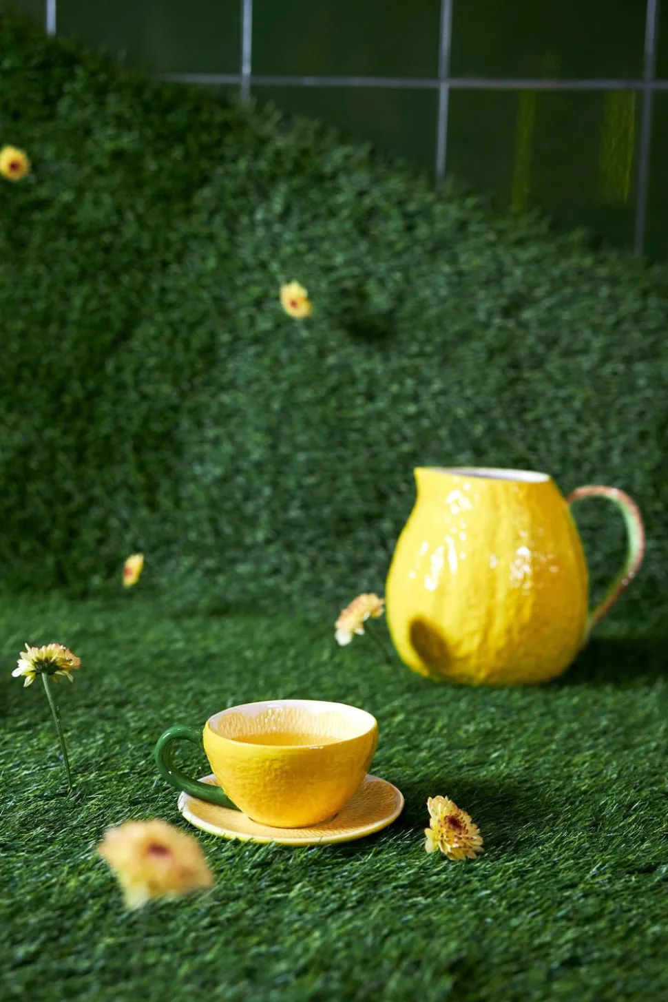 Der von Studio entworfene Krug Lemon von bringt einen lebendigen und verspielten Charakter auf den gedeckten Tisch. Der Krug in Form einer Zitrone wird aus Dolomit hergestellt, was ihm ein keramisches Aussehen mit einer glänzenden Oberfläche und skurrilen Details verleiht. Die leuchtend gelbe Farbe erinnert an Sonnenschein und warme Tage, während die Formensprache zwischen skulptural und funktional balanciert.