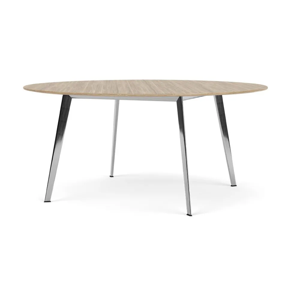 Der JW Tisch JW160 von , entworfen von Jakob Wagner, hat ein schlankes und klassisches rundes Design, das Symmetrie verleiht und harte Linien in jedem Interieur abmildert. Der Tisch ist in verschiedenen Materialien und Größen erhältlich und passt perfekt in jede Wohnung, Cafeteria oder jedes Büro. Die charakteristischen dreieckigen Beine sind leicht angewinkelt, um ausreichend Beinfreiheit zu bieten, während die Struktur des Tisches solide und stabil bleibt.