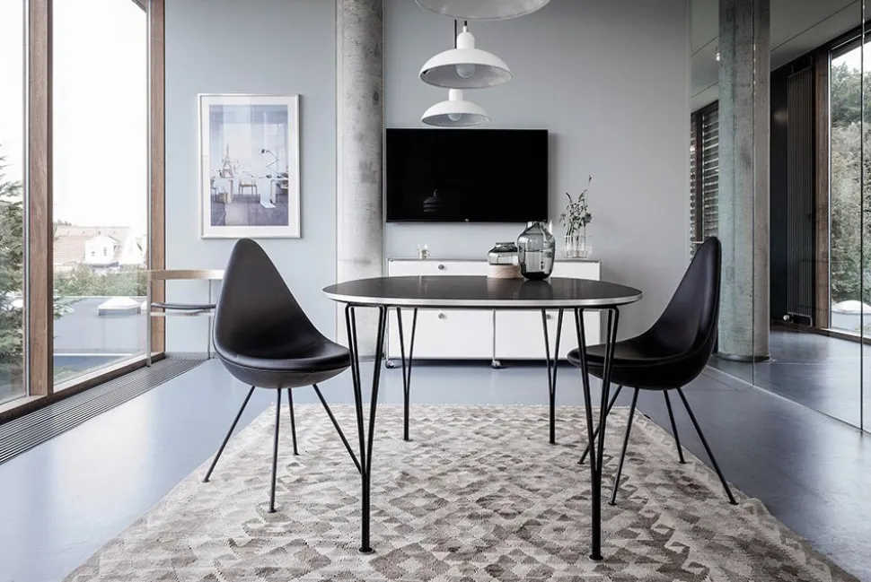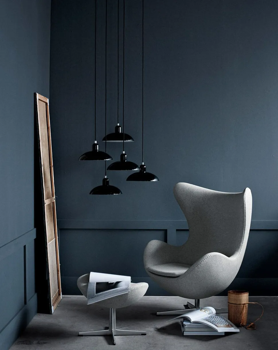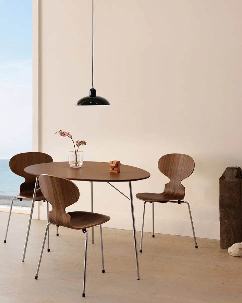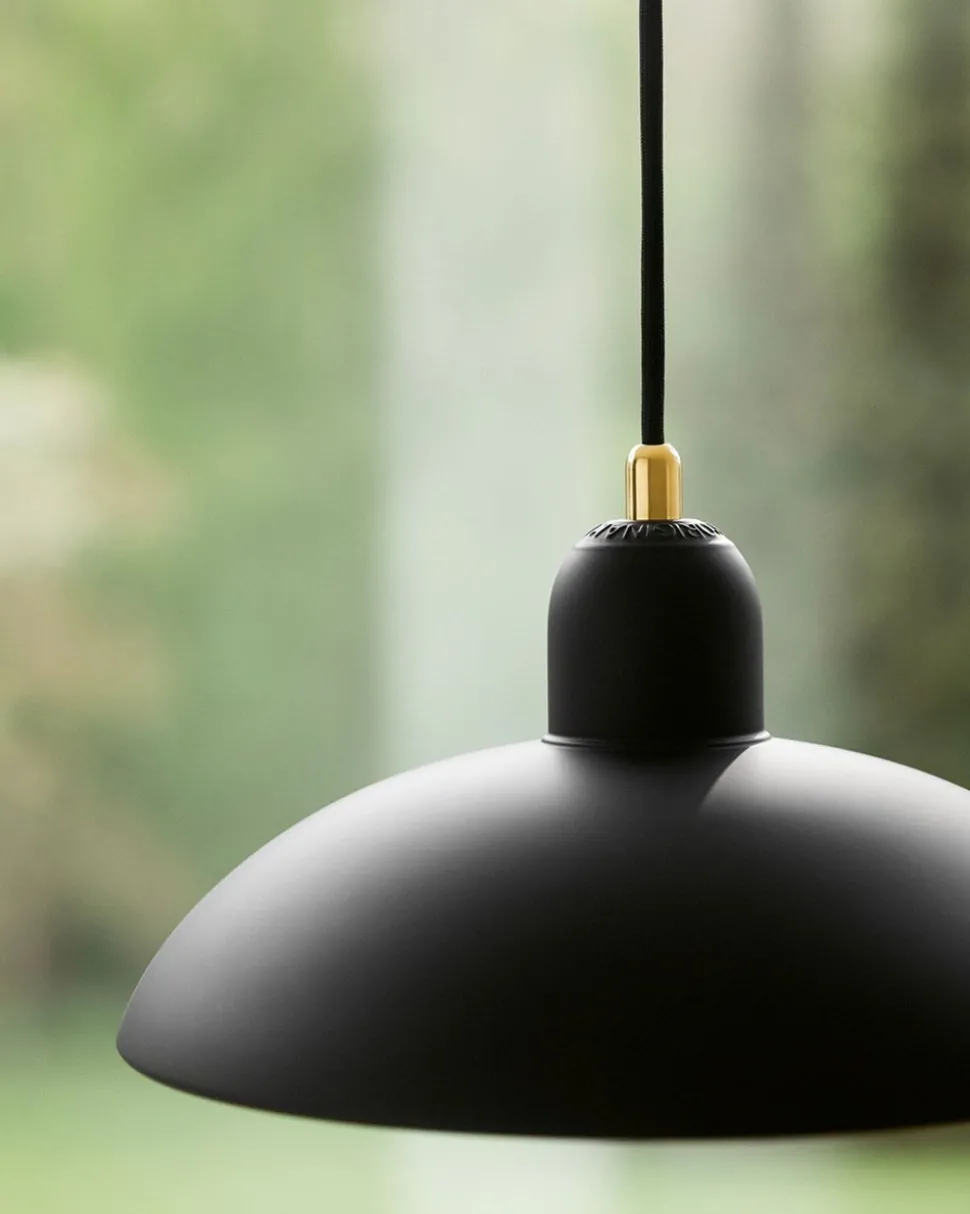 Der breite Hängeschirm ist der Form der klassischen Tischleuchte nachempfunden und erzeugt ein breites und diffuses Licht, das große Teile des Raums um ihn herum beleuchtet. Die glänzende Oberfläche der Leuchte bildet einen schönen Kontrast zum mattweißen Inneren des Schirms, die beide ihre eigene Funktion haben und sich gegenseitig ergänzen.