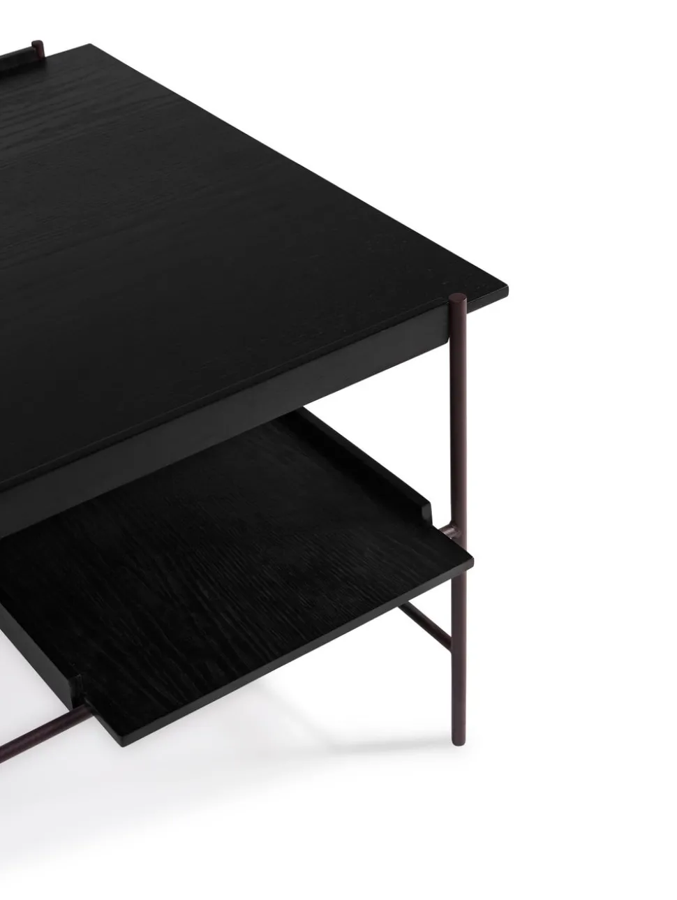 Der Kanso Couchtisch von , entworfen von Laura Bilde, ist ein multifunktionales Möbelstück, das Eleganz und Zweckmäßigkeit verkörpert. Dieser Couchtisch besteht aus einem minimalistischen Metallgestell, das Tischplatten aus Eschenholz trägt. Diese Tischplatten lassen sich leicht in freistehende Tabletts verwandeln und bieten eine vielseitige Funktionalität, die über einen typischen Couchtisch hinausgeht.