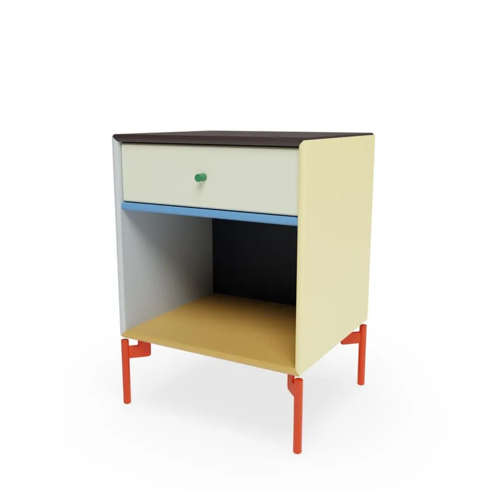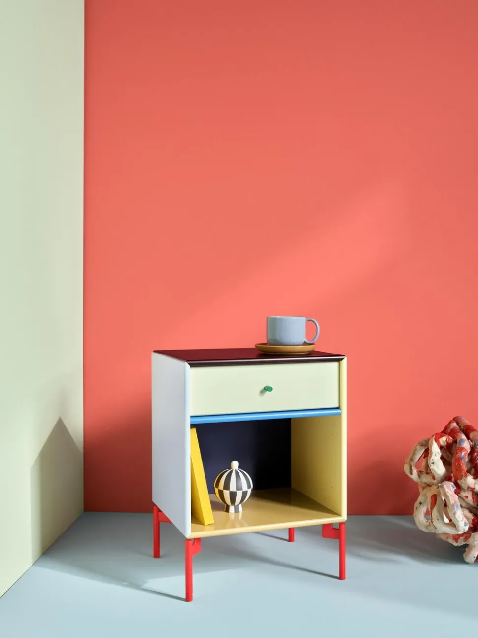 Das kompakte Design macht den Nachttisch ideal für die Aufbewahrung von Büchern, Gläsern und anderen kleinen Gegenständen. Das offene Regal und die Schublade sorgen für praktische Ordnung, während die kräftigen Farben für Charakter sorgen. Perfekt als Nachttisch im Schlafzimmer oder als Beistelltisch im Wohnzimmer, wo er mit den anderen farbenfrohen Modulen von kombiniert werden kann, um einen dynamischen Look zu erzielen. Für einen kompletten Look können Sie ihn mit gedeckten Tönen oder anderen kräftigen Farben kombinieren.