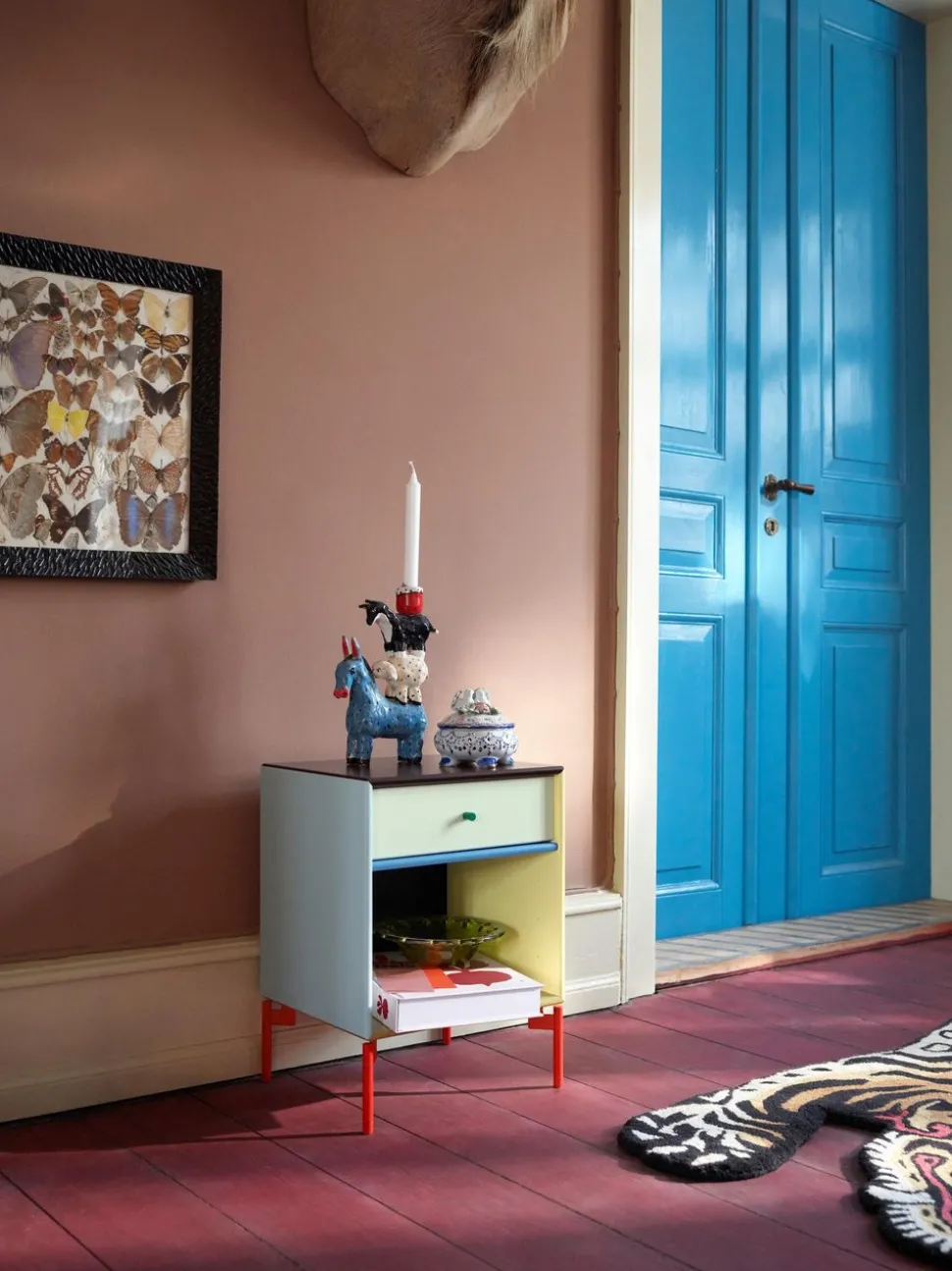 Kimpop Dream von , entworfen von Peter J. Lassen & KIMPOP, ist ein Nachttisch, der Farbe in das Schlafzimmer bringt. Mit seiner verspielten Farbpalette bricht er mit den skandinavischen Farbtraditionen und verleiht ihnen einen einzigartigen, künstlerischen Ausdruck. Die Seiten des Tisches sind in subtilen Tönen wie Oyster und Cumin gehalten, während die Schublade, der Griff und die Ablage in Pomelo, Parsley und Azure leuchten. Die Rückwand in Shadow schafft Tiefe, während die auffälligen hagebuttenroten Beine einen starken optischen Akzent setzen. Kimpop Dream verbindet Funktionalität und kühne Ästhetik zu einer harmonischen Komposition.