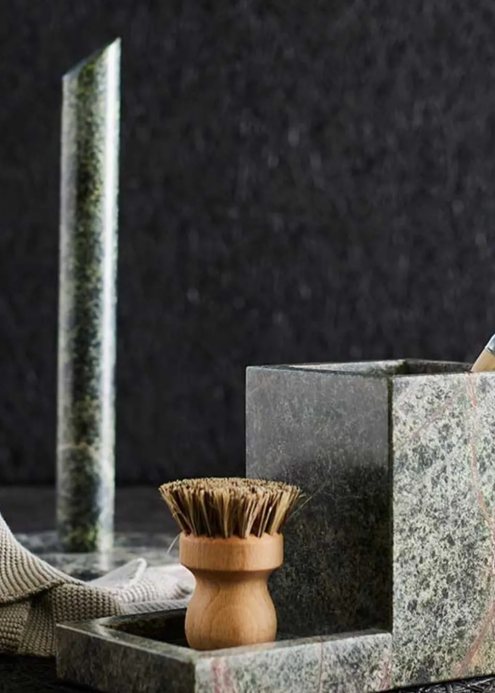 Funktionalität und Stil treffen in diesem Papierhandtuchhalter zusammen, der als skulpturale Schönheit in der Küche steht. Die kühle Eleganz des grünen Marmors passt sowohl zu hellen als auch zu dunklen Küchenelementen und ist ein echter Blickfang, der sowohl praktisch als auch dekorativ ist. Um den natürlichen Glanz und den Charakter des Marmors zu bewahren, wird empfohlen, ihn von Hand mit neutraler Seife zu reinigen, was seinen einzigartigen und luxuriösen Charakter unterstreicht. Der Vita Papierhandtuchhalter ist nicht nur ein Küchenaccessoire, sondern ein Statement, das Funktionalität mit raffinierter Ästhetik verbindet.