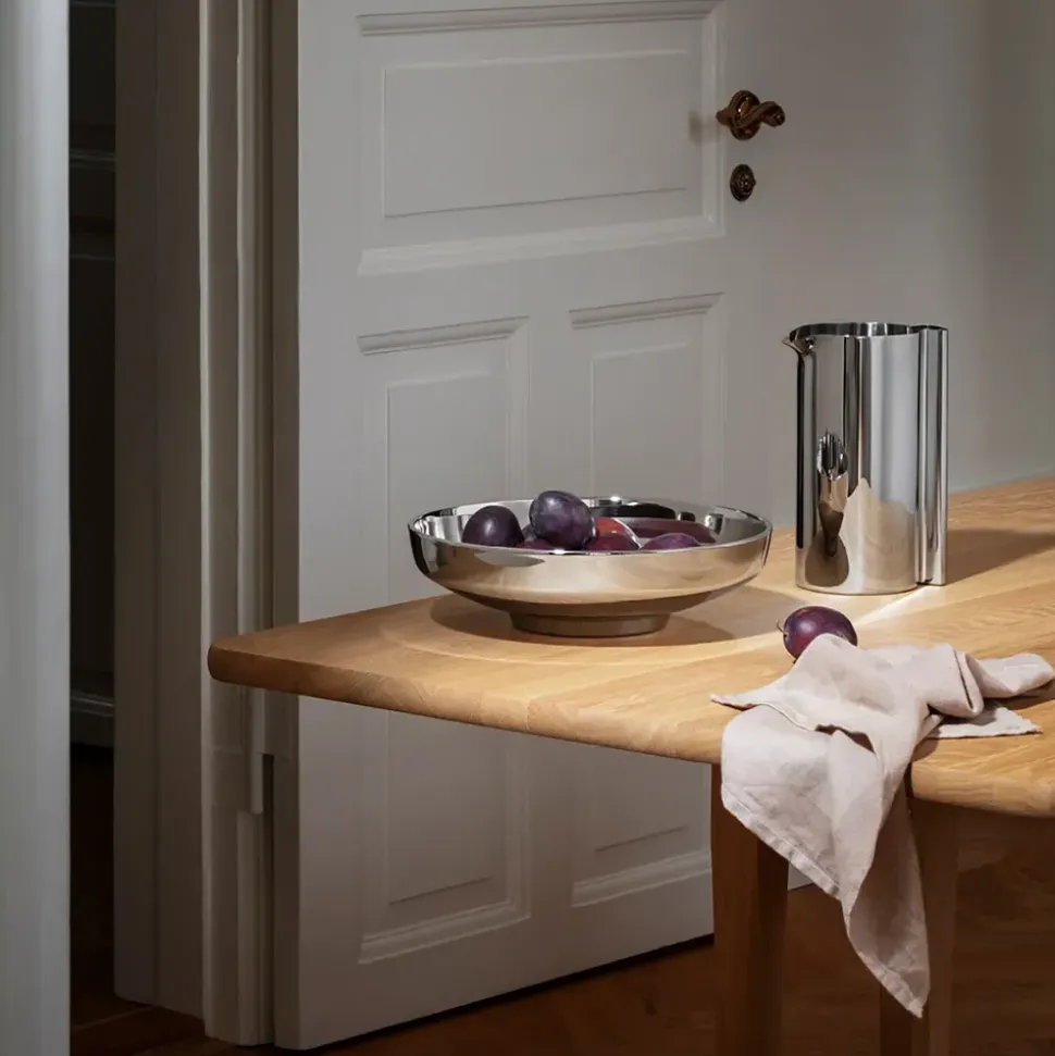 Denne bemærkelsesværdige kande, oprindeligt skabt i porcelæn af den danske designer Henning Koppel, genudgives nu for første gang i poleret rustfrit stål. Design Studio har dykket dybt ned i arkiverne for at genoplive dette arvestykke. Med sit markant individuelle udtryk fejrer kanden designerens forkærlighed for bløde, organiske former, som Koppel igennem årene har udtrykt gennem sine velkendte sølvdesigns for .