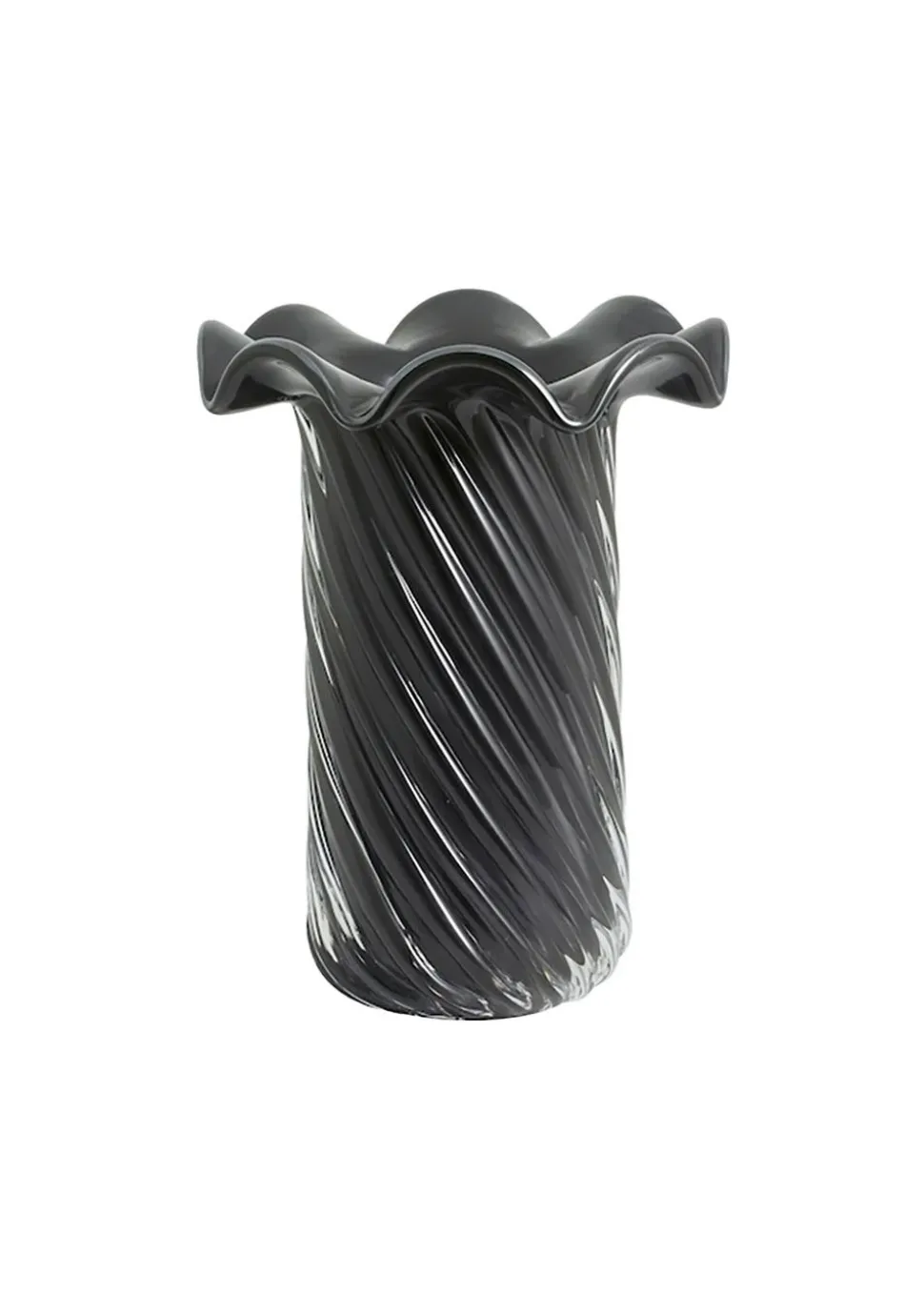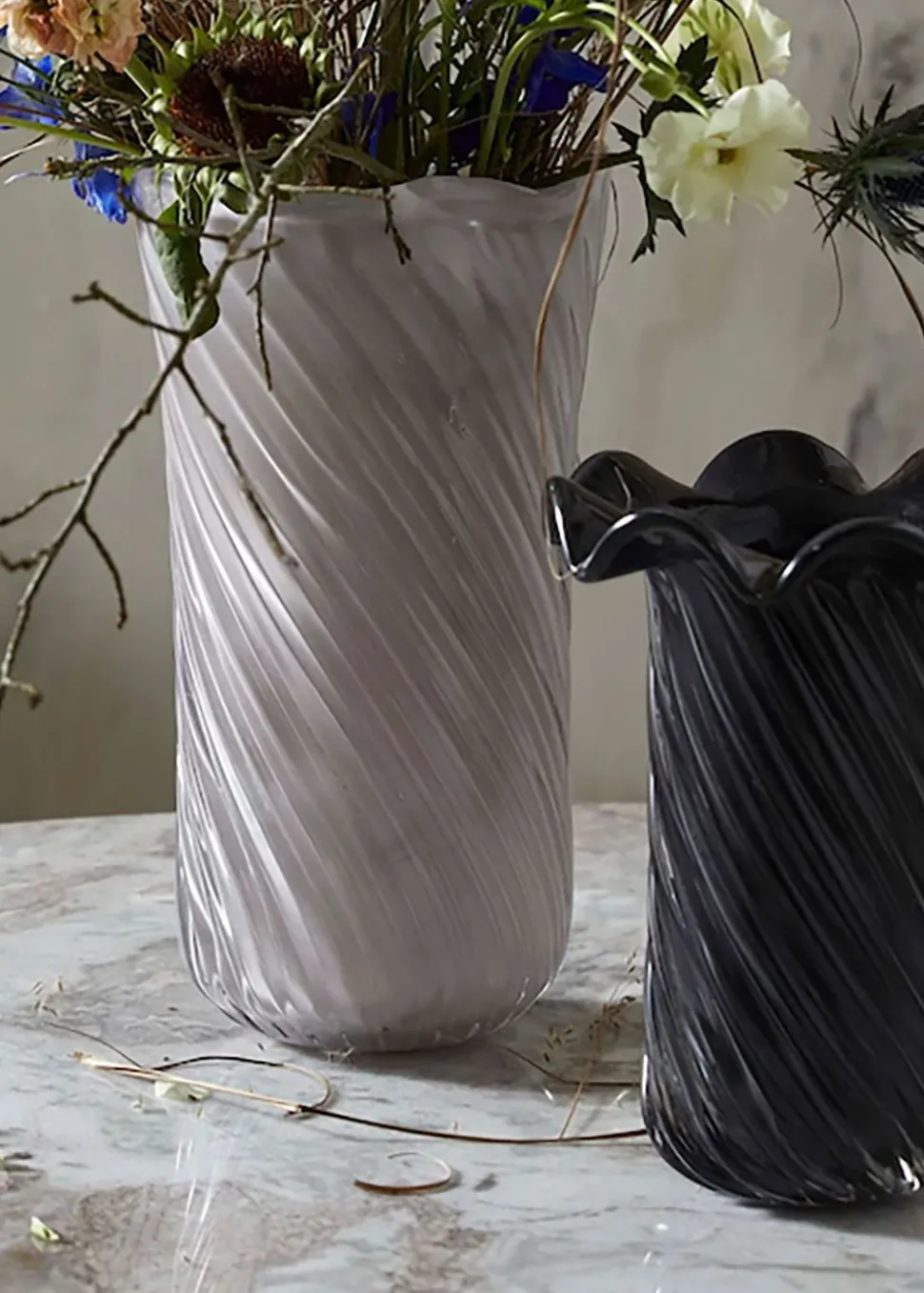 Die Vase Koro von ist eine moderne und zeitlose Schönheit. Mit ihrer zylindrischen Form und einer eleganten Wendung schafft sie den Rahmen für eine luxuriöse und elegante Vase. Der gewellte Rand setzt einen Kontrast zu dem ansonsten klassischen Design und macht sie zu einem skulpturalen Element, das perfekt mit oder ohne Blumen funktioniert.
