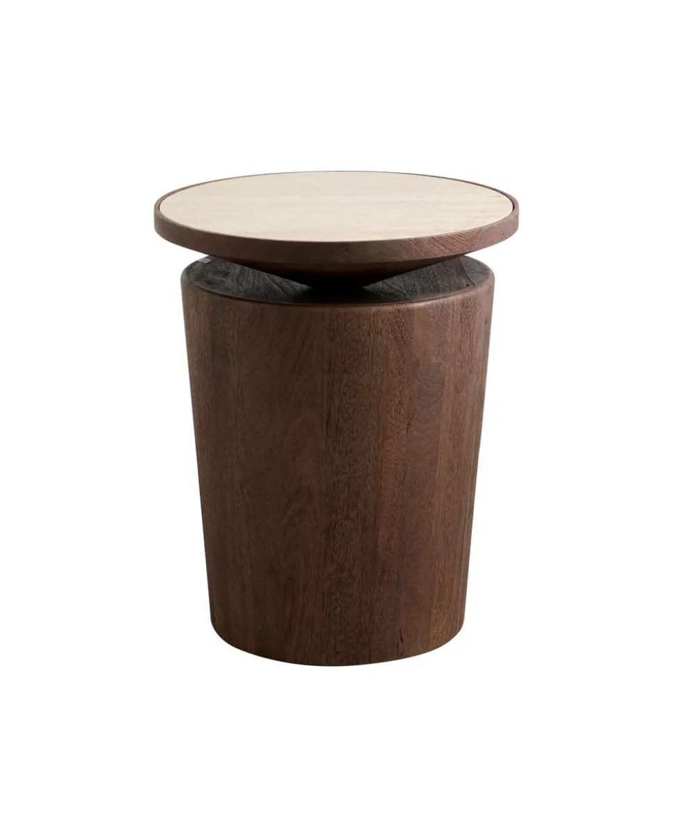Der KWANDO Beistelltisch von ist eine harmonische Kombination aus Mangoholz und Travertin, bei der der Sockel aus massivem Mangoholz mit dunklem Walnuss-Finish eine elegante Travertinplatte trägt. Dieser Beistelltisch fügt jeder Einrichtung ein ruhiges und anspruchsvolles Element hinzu und passt perfekt in moderne nordische Häuser.