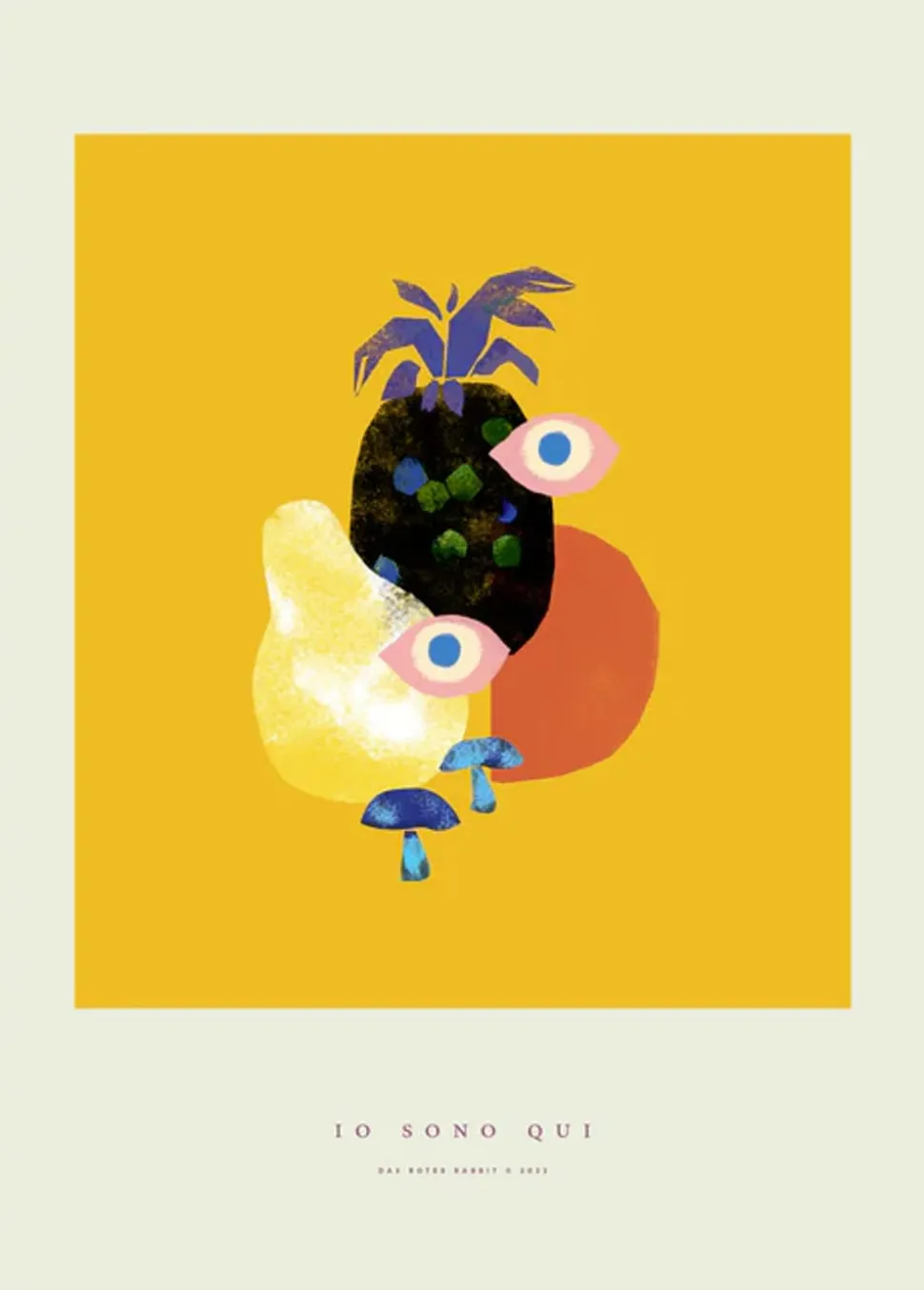 Bunte Früchte mit Augen auf einem currygelben Hintergrund.