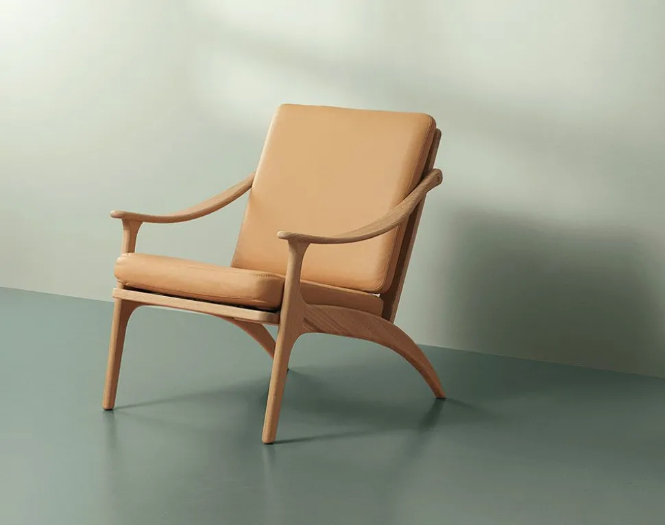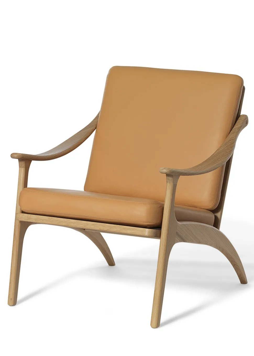 Der Lean Back Stuhl wurde bereits 1957 vom Dänen Arne Hovmand-Olsen entworfen, was sich im charakteristischen Design des Stuhls widerspiegelt. Der Stuhl ist aus klassischen Proportionen geschaffen, mit gut durchdachten Winkeln, die für besten Sitzkomfort sorgen, erhält aber auch seinen modernen Touch durch die abgerundeten Kanten, die dem Stuhl einen eleganten und schwebenden Ausdruck verleihen. Das Gestell ist sowohl in heller Eiche als auch in tiefem Teakholz erhältlich, das mit neutralen Ledern oder farbenfrohen Stoffen gepaart werden kann, um einen Stuhl sowohl für das klassische als auch für das moderne Zuhause zu schaffen.