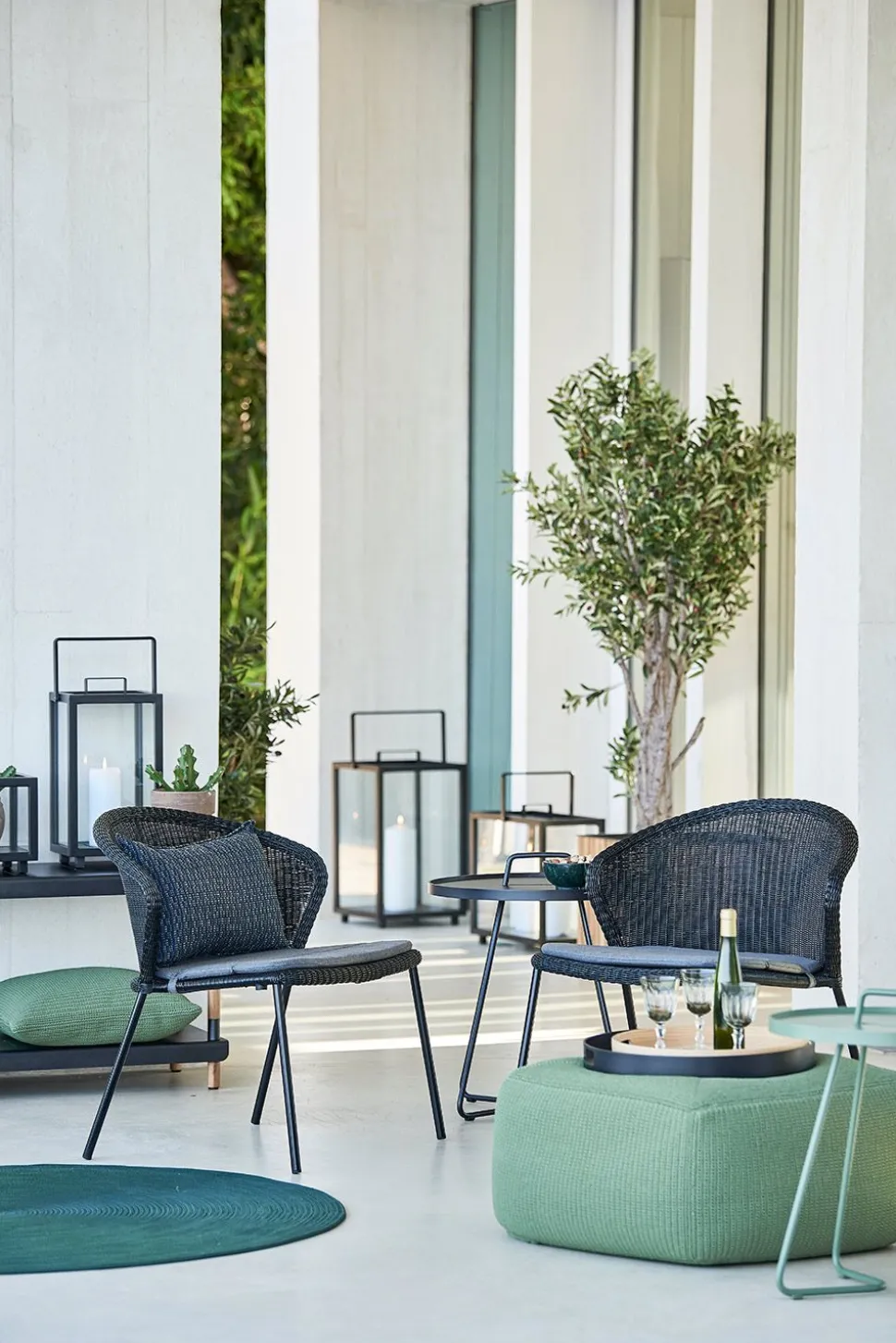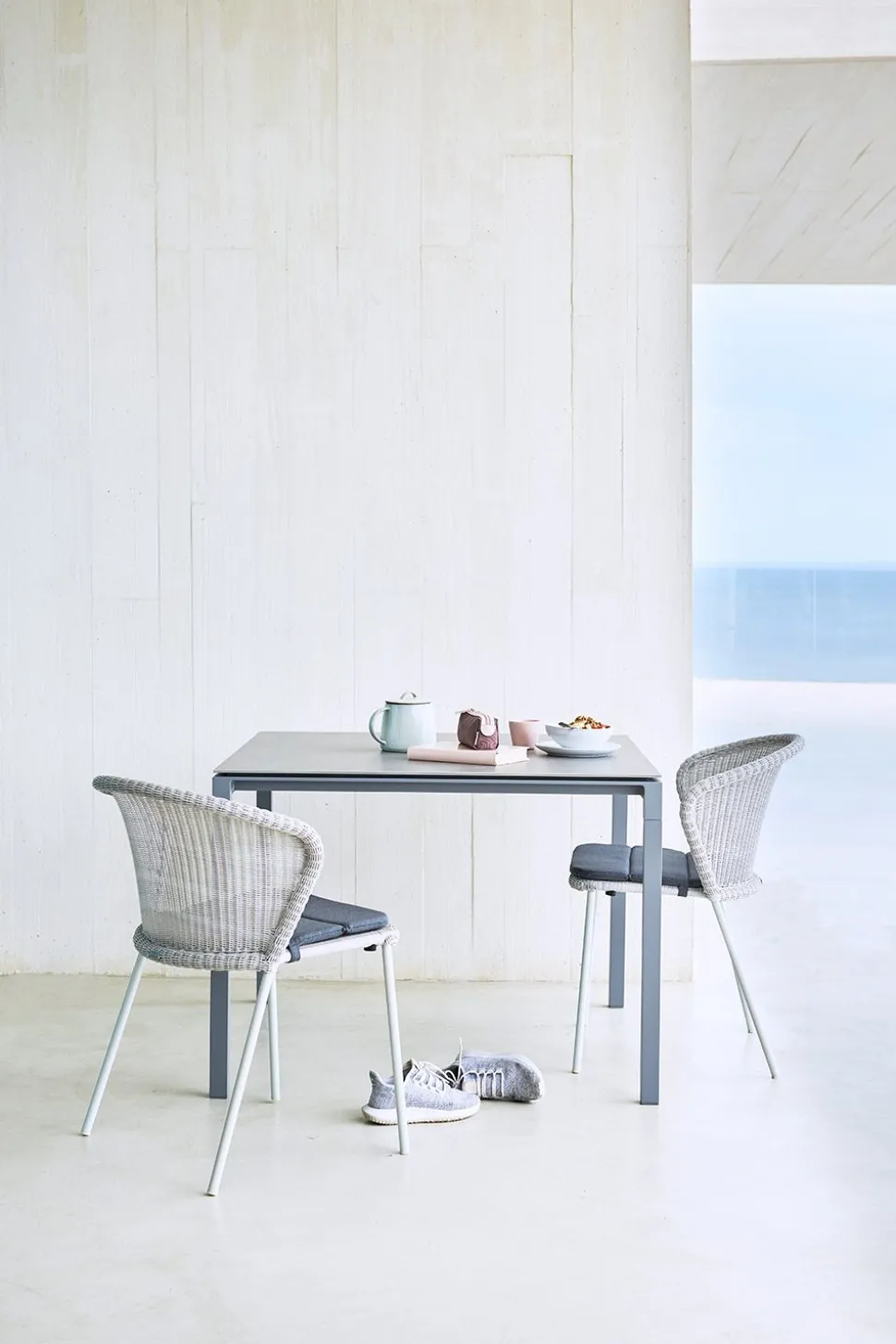 Die schlanken Stühle werden vom Design-Duo Welling/Ludvik entworfen, die für ihre rein ästhetischen Entwürfe bekannt sind, und dass jedes Detail der Möbel einen Zweck und eine Funktionalität hat. Die Stühle sind aus Cane-Line-Geflecht oder Cane-Line-French-Geflecht mit einem Aluminiumrahmen gefertigt. Für die Stühle kann ein Kissen gekauft werden.