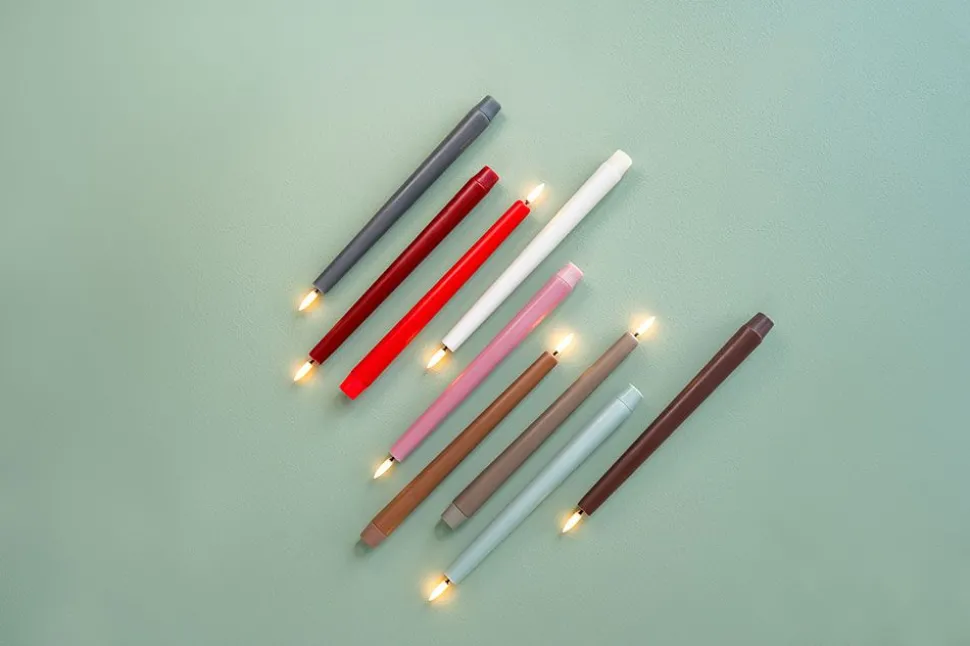 Die schlichte und elegante LED Taper Candle wurde von entworfen. Die traditionellen Kerzen werden aus Paraffin hergestellt. Die Idee hinter der LED Taper Candle war es, eine Kerze zu entwickeln, die das Risiko der chemischen Verbindungen, die bei einem normalen Verbrennungsprozess freigesetzt werden, eliminiert. Die LED Taper Candle wurde mit den gleichen Grundprinzipien in Bezug auf Zweck und Design nachgebildet und ist daher in LED ausgeführt. Sie verfügt über 3 Dimmoptionen sowie 4 Timer-Einstellungen: 4, 6, 8 und 10 Stunden. Die Kerzen werden in einer Packung mit zwei Kerzen verkauft.