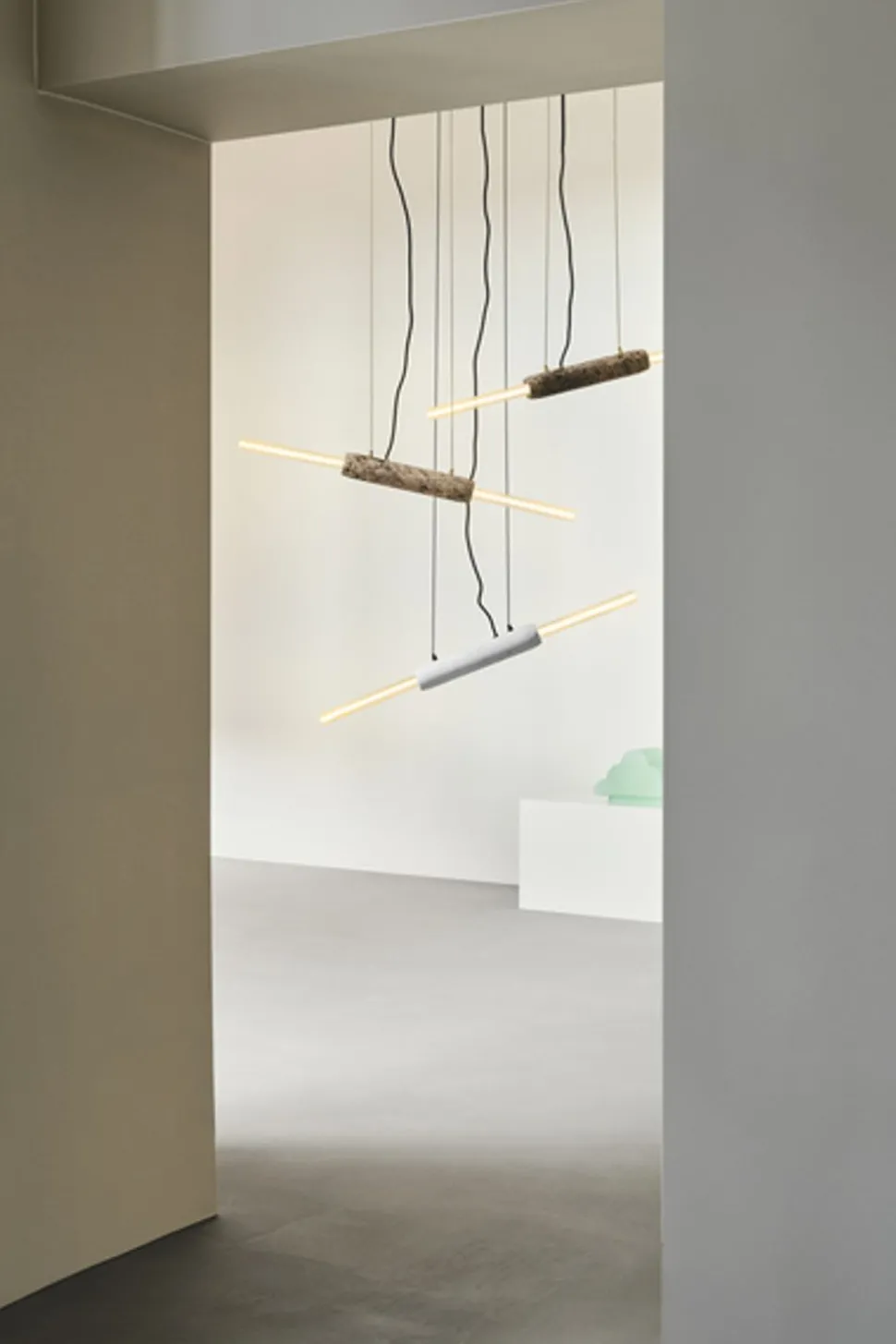 Die Hängeleuchte wurde Limbo genannt, da sie keine feste Richtung hat. Sie kann in jeder Richtung aufgehängt werden – nach oben, nach unten, vertikal oder horizontal, je nach Wunsch.