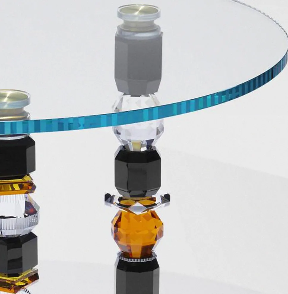 Der Louisiana-Tisch von kombiniert moderne Trends mit Details und Materialien, die vom Glam-Art-Dekorstil inspiriert sind. Eine einfache Glasplatte mit sauberen, scharfen Kanten ruht auf Teetischbeinen, die aus Säulen aus farbigem Kristallglas in geometrischen Formen bestehen. Der ästhetische Ausdruck und das skulpturale Design des Tisches sorgen für Aufmerksamkeit in jedem Raum und verleihen jedem Dekor eine exklusive Note.