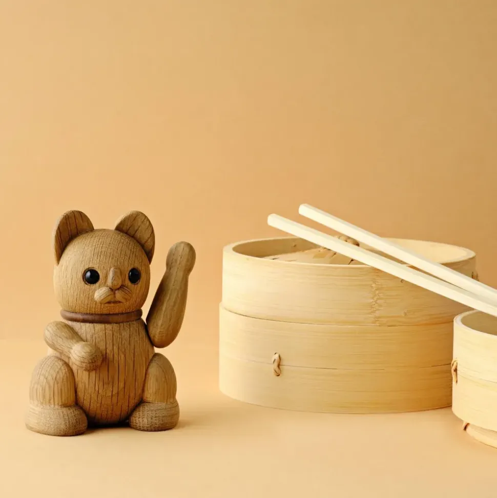 Lucky Cat fra er en charmerende fortolkning af den ikoniske maneki-neko, som traditionelt bringer held og lykke. Udført i smukt egetræ med et harmonisk formsprog, tilføjer den en følelse af varme og positiv energi i hjemmet. Den kompakte størrelse på 11 cm gør Lucky Cat til en perfekt følgesvend på hylder og små overflader, hvor dens naturlige åremønstre fremhæver træets unikke karakter.