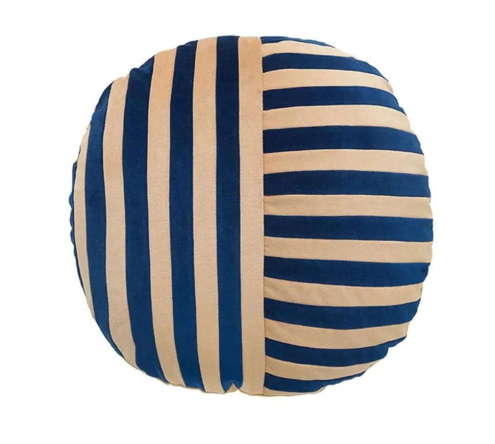 Das Kissen ist auf der Rückseite einfarbig und auf der Vorderseite gemustert, wodurch ein raffiniertes und einzigartiges Muster entsteht, bei dem die jeansblauen Streifen über das Beige laufen.