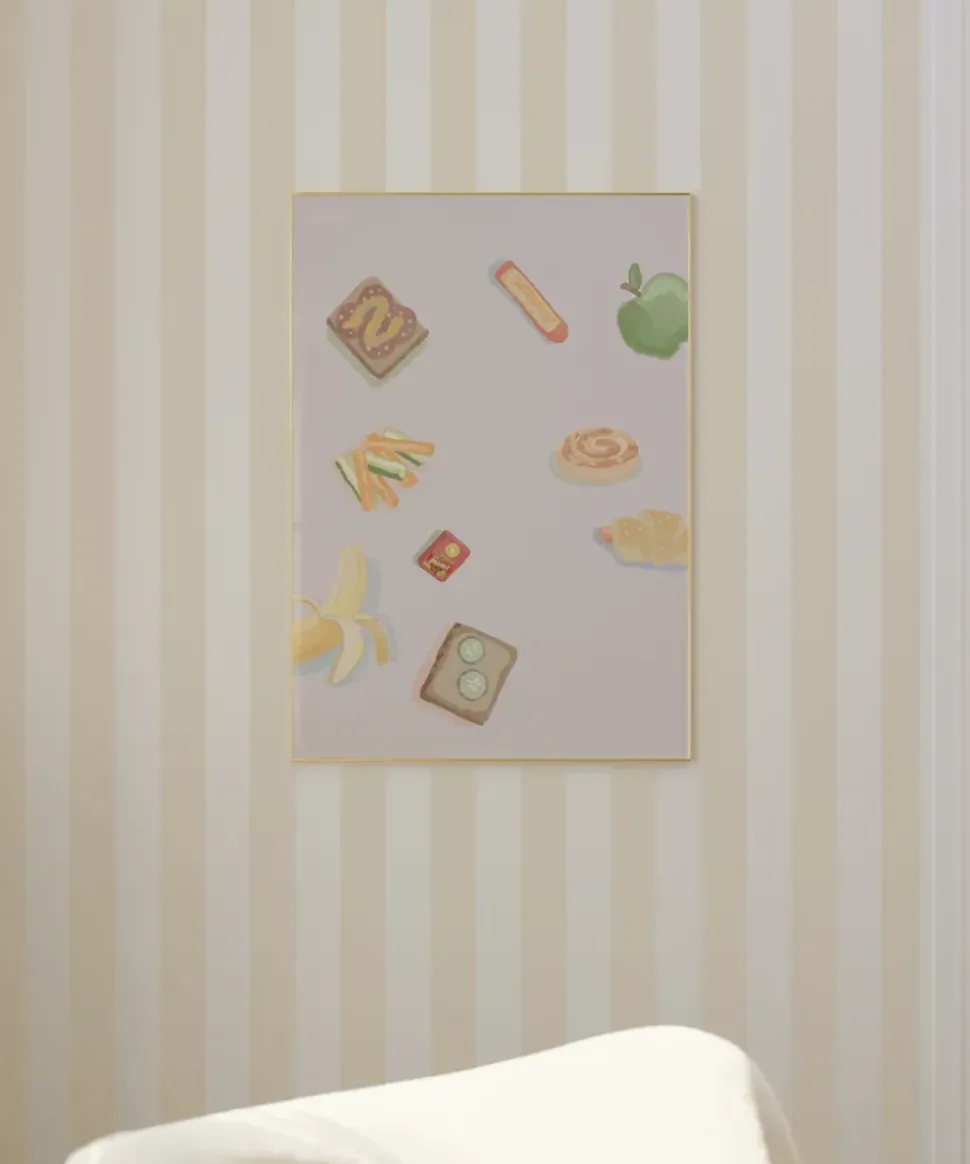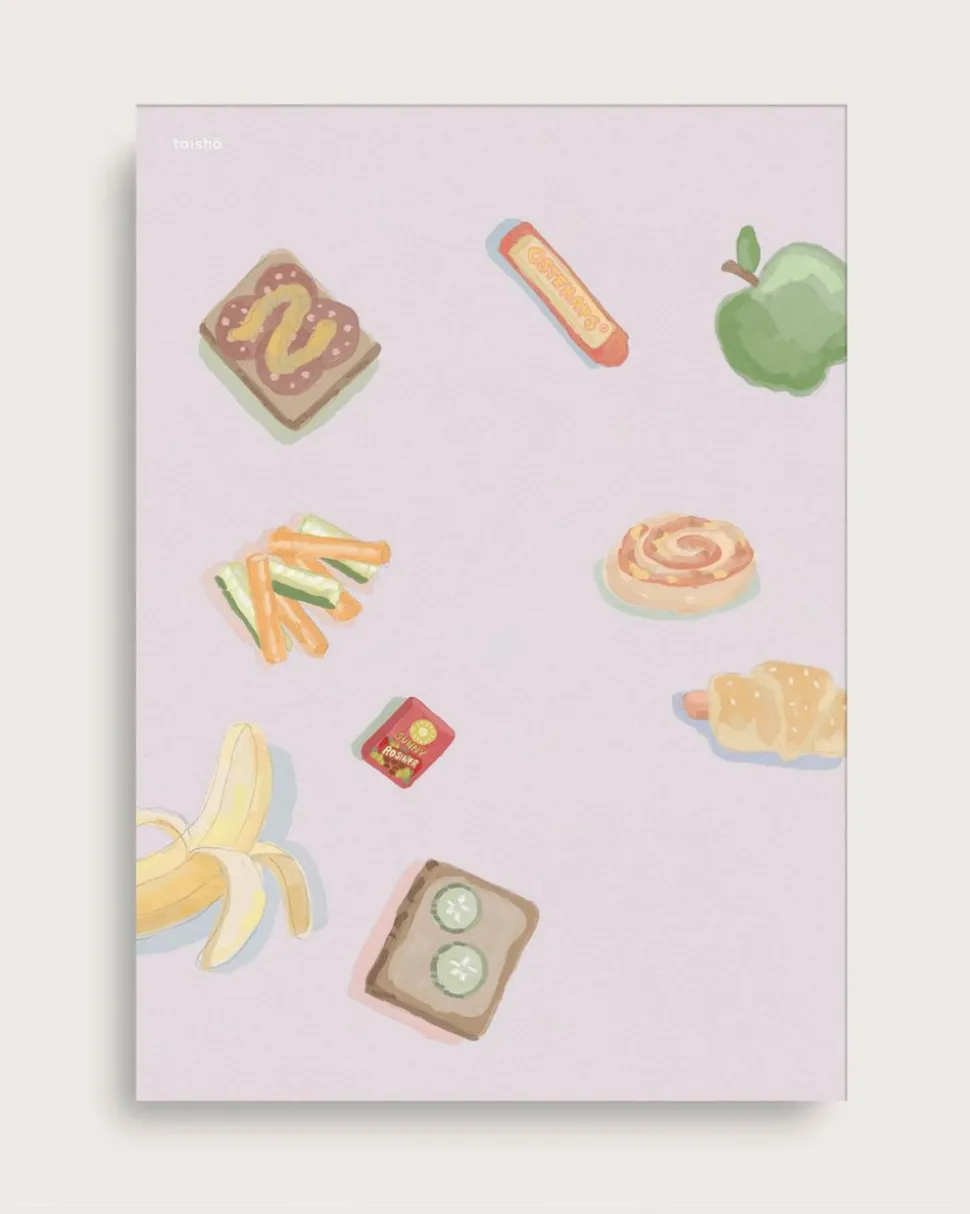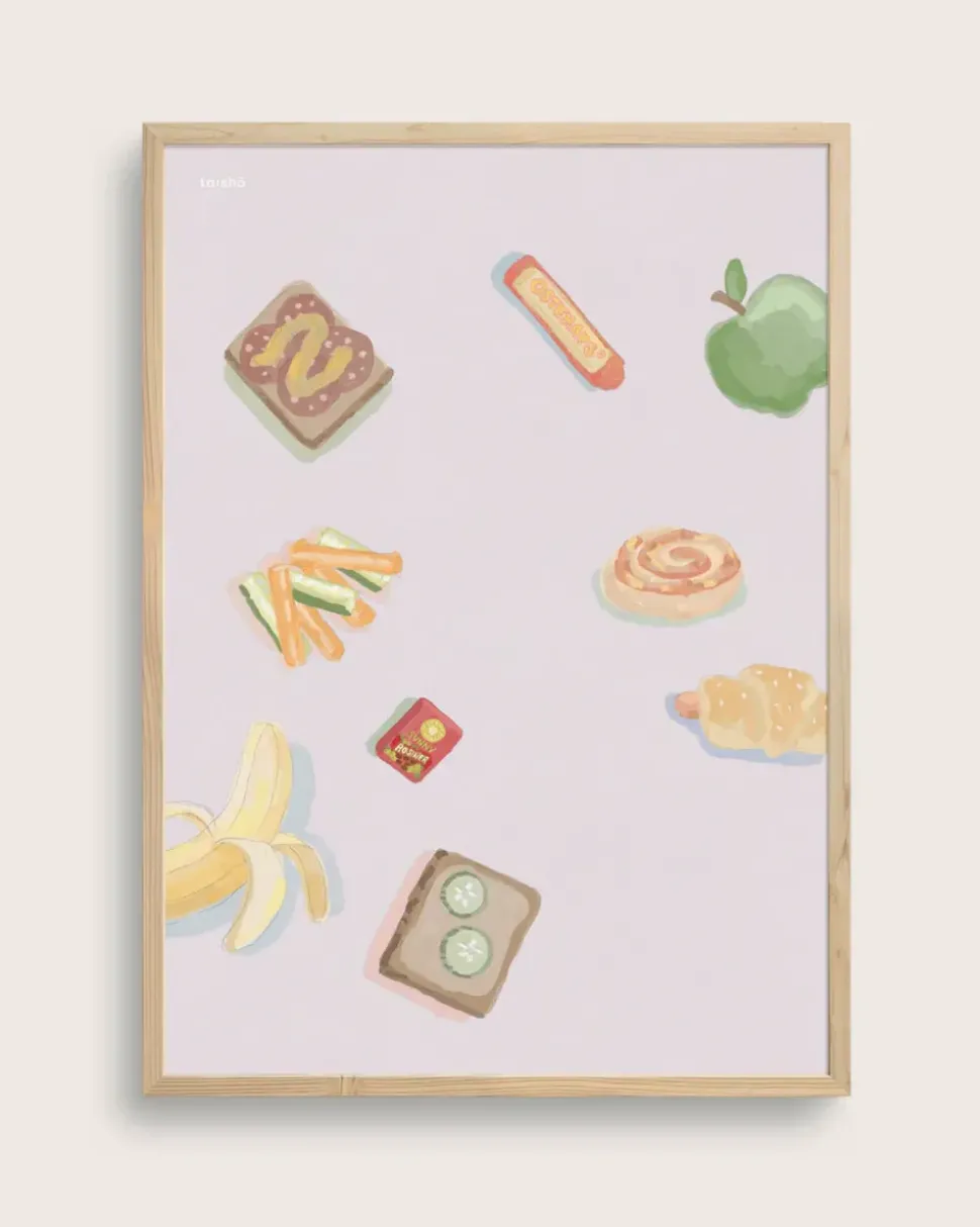Lustiges Kinderposter mit Lebensmitteln aus dem typischen Lunchpaket. Auf dem Plakat finden Sie Motive von Käselaib, Pizzabrötchen, Wurst, Gemüsesticks, Rosinen, grünem Apfel, Banane, Leberpastete und Wursthörnern. Schaffen Sie in der Küche eine gemütliche Atmosphäre für die ganze Familie.
