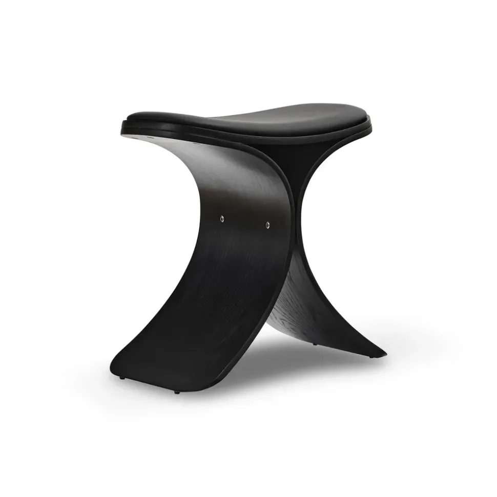 Material: Der Hocker ist in drei eleganten Varianten erhältlich: in dunkler Eiche mit dunkelbeigem Stoff, in klassischer Eiche mit beigem Stoff und in einer raffinierten Version in schwarzer Eiche mit schwarzem Leder.