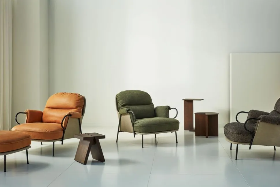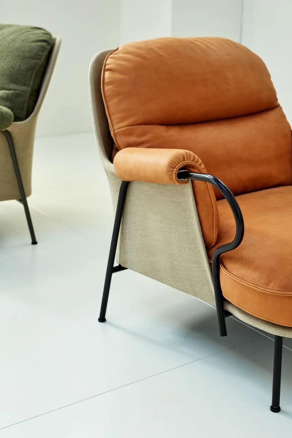 Das schöne lyra-Möbel von Andreas Engesvik ist ein einzigartiges Möbelstück, bei dem Komfort und Entspannung im Mittelpunkt stehen. Das Möbel besteht aus einer Canvas-Schale mit einer weichen Formensprache, die perfekt zu den voluminösen Kissen passt, die für Sitzkomfort sorgen. Das Möbel ruht auf einem Sockel aus eleganten Metallrohren, die zwei Armlehnen bilden, die einen Kontrast zu der hellen Leinwand bilden.
