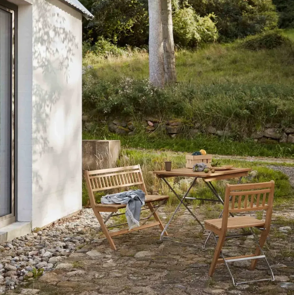 - Materialien: Teakholz und rostfreier Stahl.