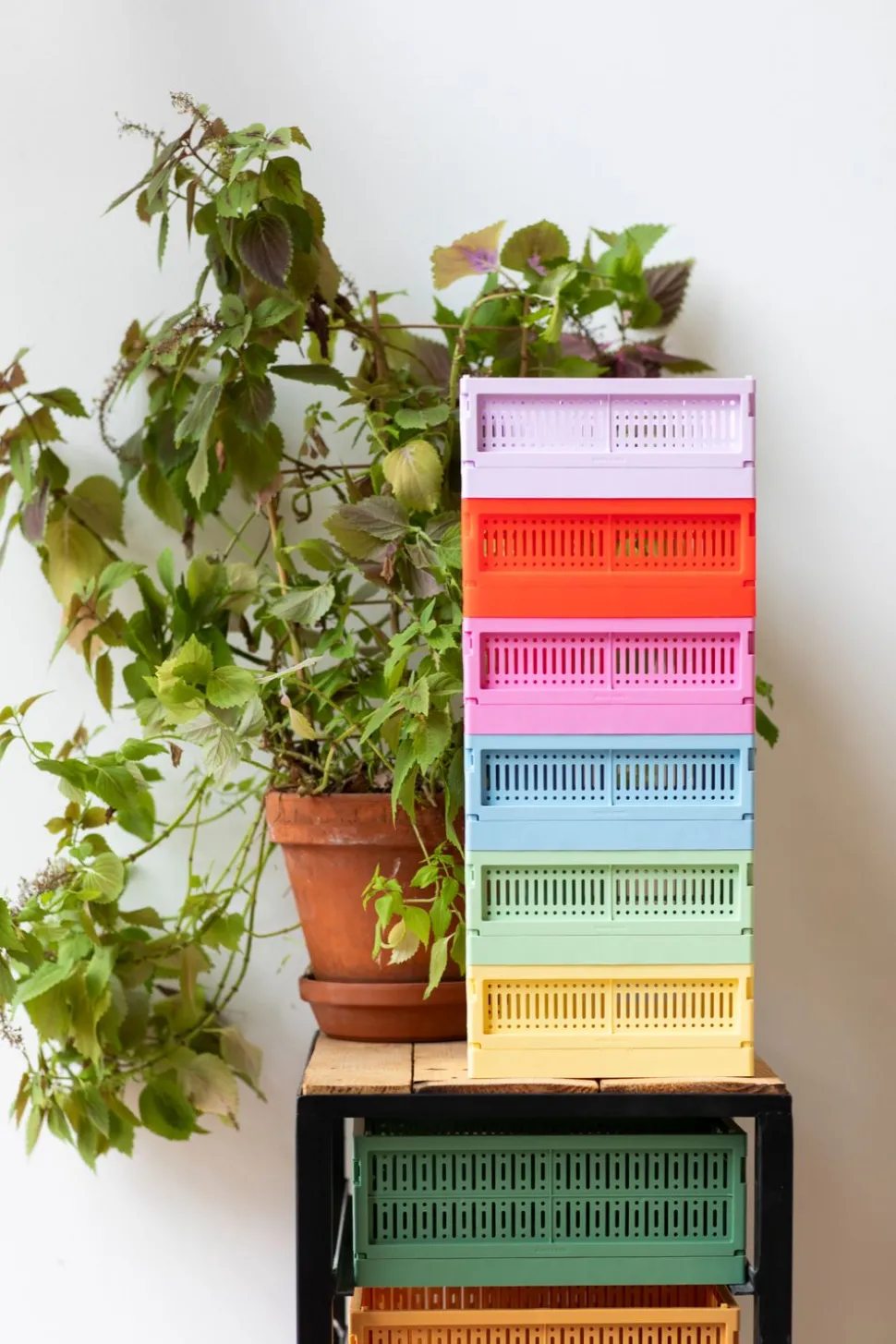 ist eine Reihe von umweltfreundlichen Faltkisten mit einem einzigartigen Design. wird zu 100 % aus recycelten Kunststoffabfällen hergestellt und in Europa produziert und bietet verantwortliche Aufbewahrungslösungen. Diese Kisten sind stapelbar, in drei verschiedenen Größen erhältlich und in einer breiten Palette von leuchtenden Farben verfügbar. Nachhaltig, stapelbar, stilvoll – definiert die Aufbewahrung mit einem grünen Touch neu.