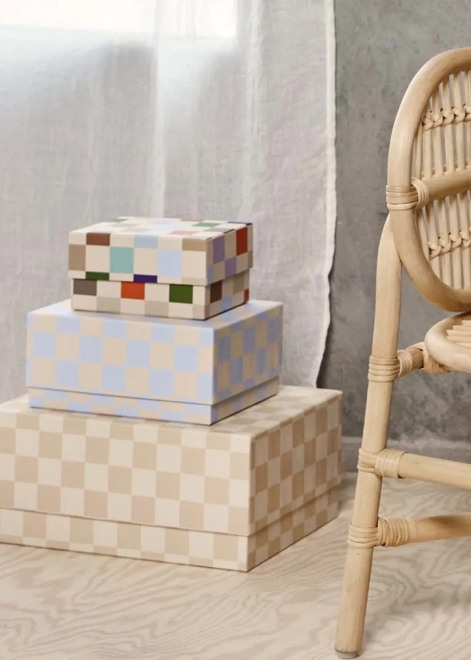 Mana opbevaringsbokse fra bringer legende opbevaring ind i dit hjem med et skakternsmønster, der skiller sig ud. Dette sæt af tre bokse er fremstillet i 100% pap og kombinerer funktionalitet med et strejf af finurlig elegance. Perfekte til at organisere legetøj, bøger eller andre hverdagsgenstande, disse bokse tilføjer en unik charme til ethvert rum.