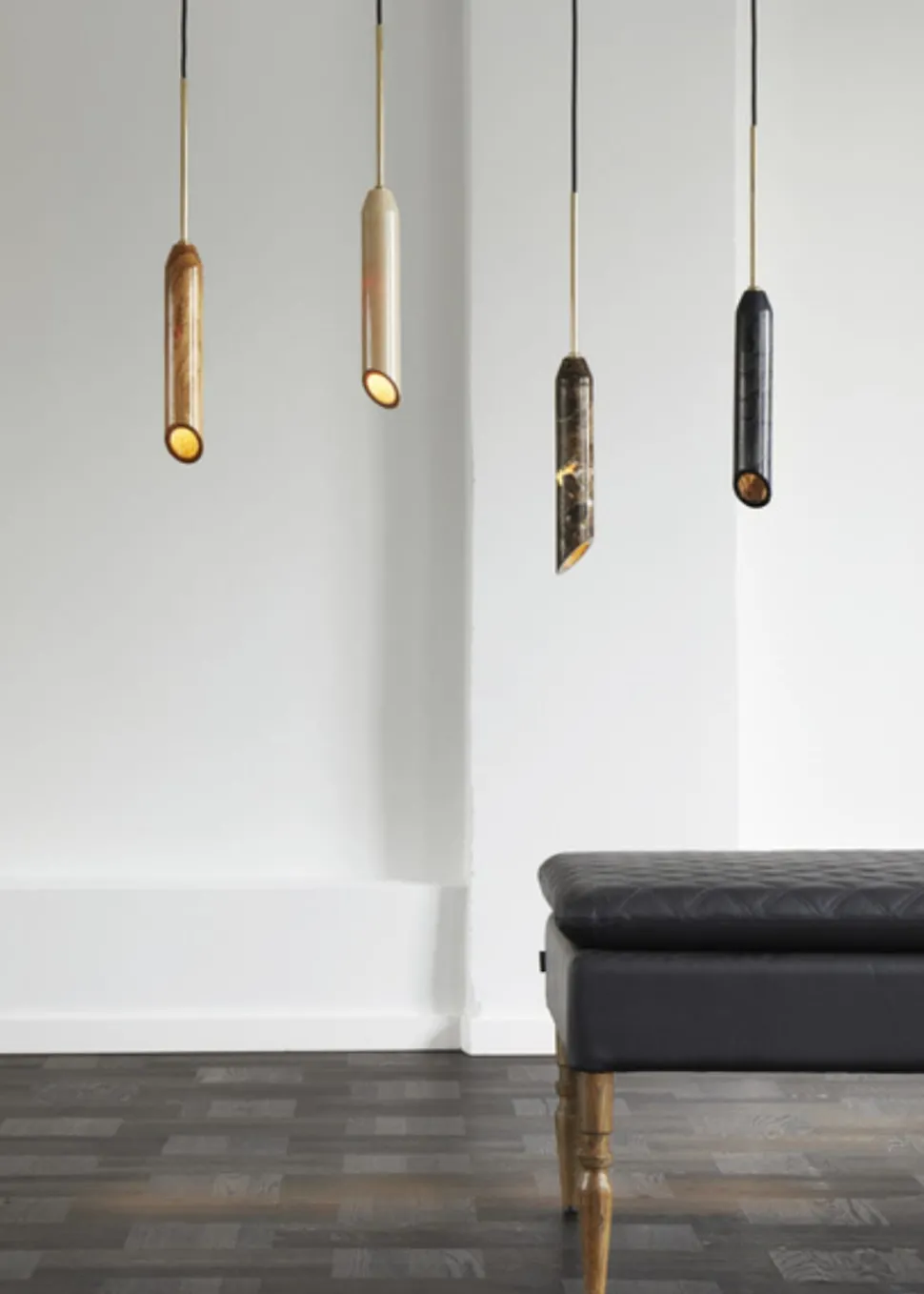 Die Marble Art Lampe ist eine elegante Lampe, die ein direktes, nach unten gerichtetes Licht abgibt. Der Korpus besteht aus einem glatt polierten Marmorzylinder mit goldener Aufhängung. Jede Lampe hat aufgrund der Beschaffenheit des Marmorsteins ein einzigartiges Muster. Die Leuchte ist in verschiedenen Varianten erhältlich.