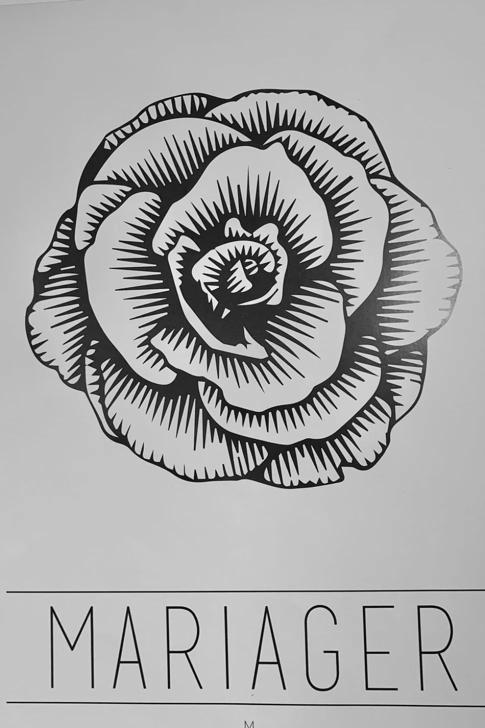 Plakat mit Rose, das die Stadt Mariager symbolisiert – die Stadt der Rosen.