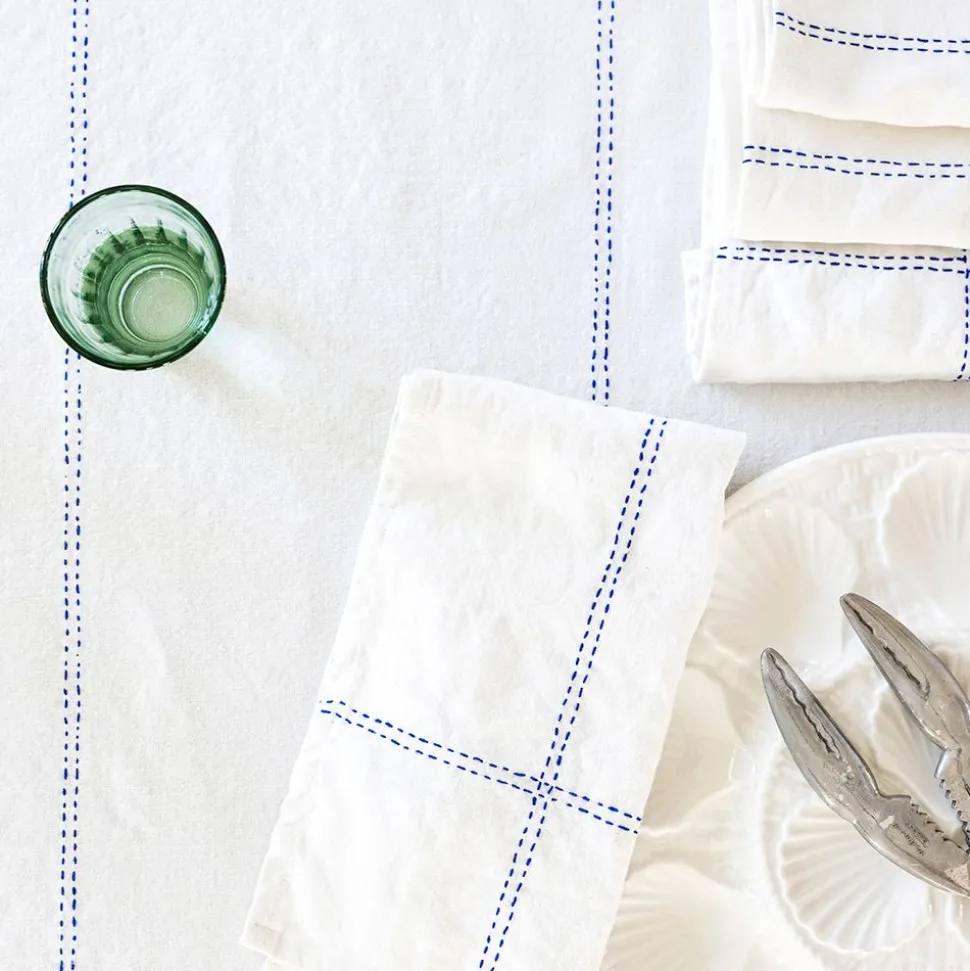 Wenn Sie diese Tischdecke sehen, werden Sie sofort von ihrem bezaubernden Aussehen fasziniert sein. Die handgestickten blauen Nähte werden mit außergewöhnlichem Geschick und Präzision ausgeführt und spiegeln eine Tradition von Ästhetik und Qualität wider. Die Tischdecke ist aus hochwertigen Materialien gefertigt und wird viele Jahre lang schön bleiben.
