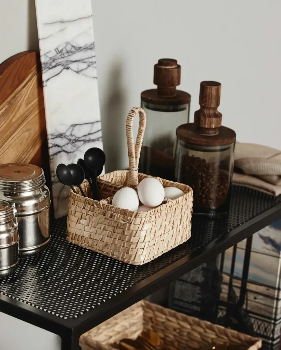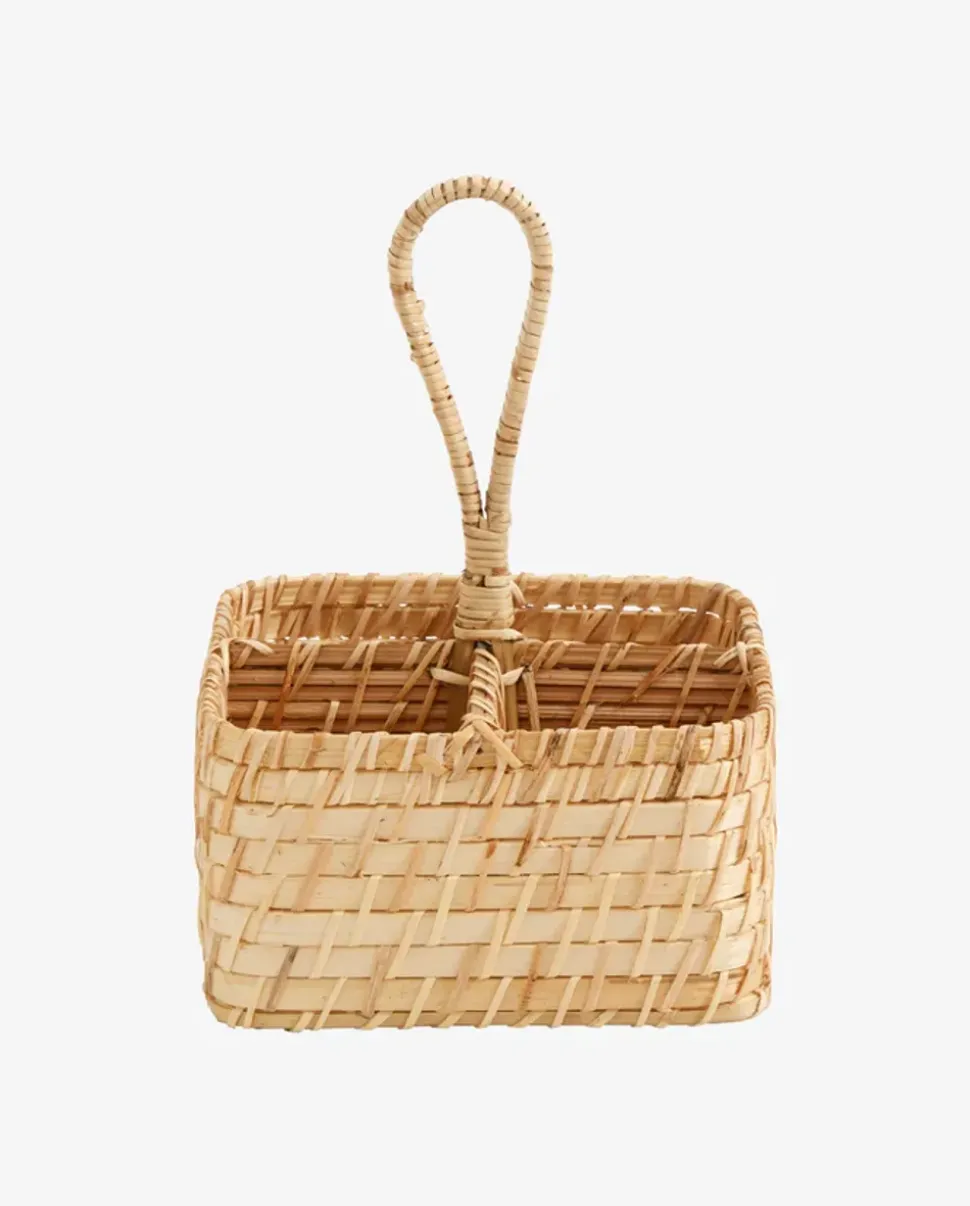 Niedlicher und praktischer Korb aus geflochtenen Naturmaterialien. Der Weidenkorb ist in 4 Fächer unterteilt und verfügt über einen praktischen Griff in der Mitte, der die Aufbewahrung und den Transport erleichtert. Verwenden Sie ihn als Korb für Besteck, für Öle und Gewürze, zur Aufbewahrung verschiedener Gegenstände im Badezimmer, im Gartenhaus oder Gewächshaus.
