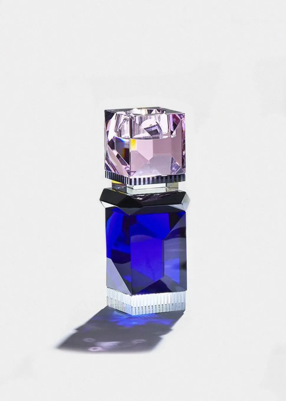 Der Miami-Kerzenhalter von besteht aus einer eleganten Kombination aus zweifarbigem Kristallglas, das in einem dreiteiligen geometrischen Design eine einzigartige farbenfrohe Reflexion im Licht erzeugt. Das Kristallglas des Kerzenständers ist handgeschnitzt und passt perfekt zu ähnlichen Glasdekorationen, für eine elegante Symphonie aus farbigem Glas.