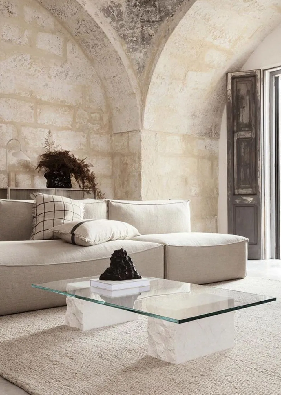 Eine perfekte Kombination aus Eleganz und rustikalem Design. Der Mineralien-Tisch von mit seiner klaren, glatten Glasplatte und dem rustikalen, rauen Mineralstein ist ein einzigartiges und auffälliges Möbelstück, das für Leichtigkeit im Raum sorgt.