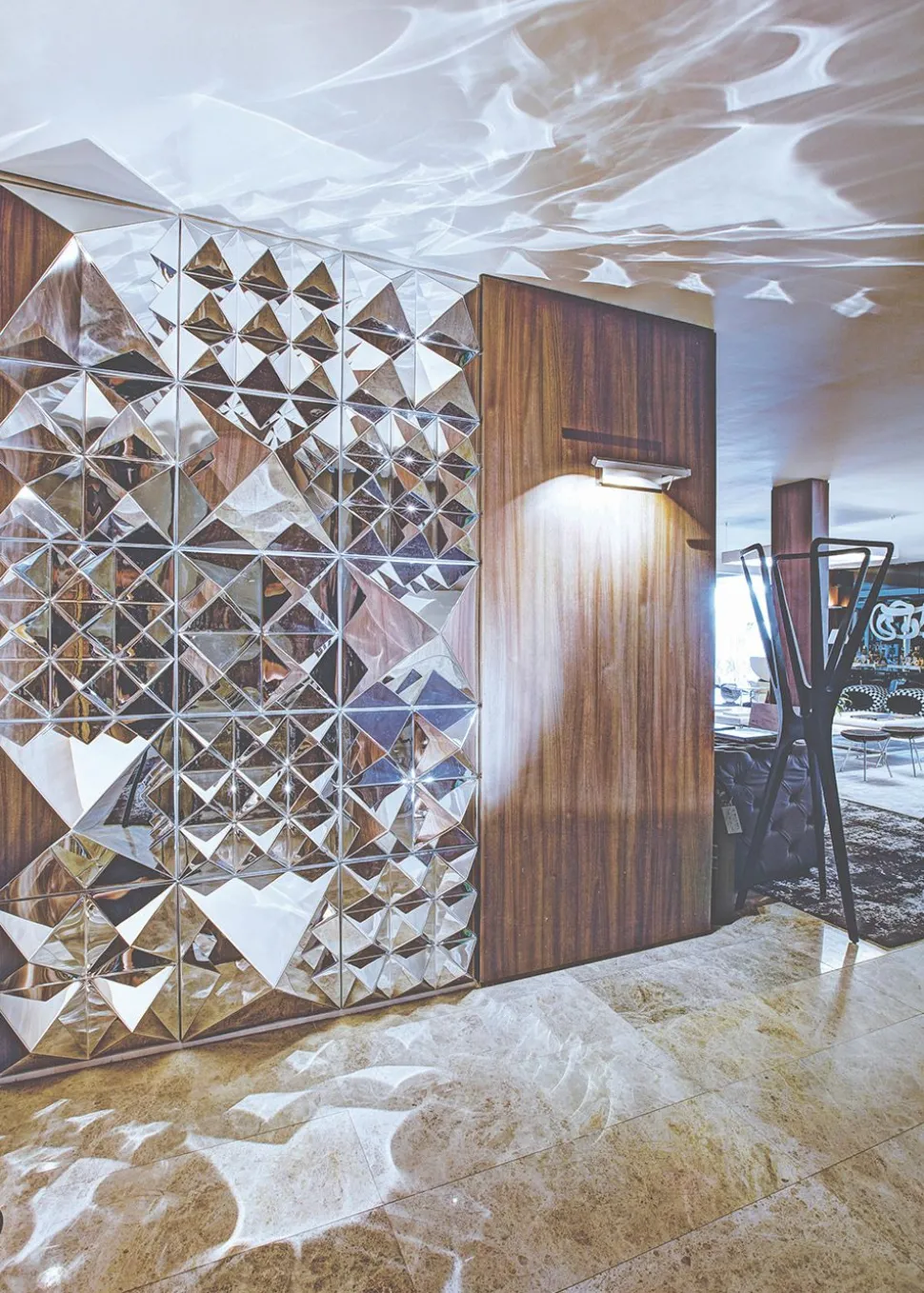Mirror Sculptures wurde 1965 von entworfen. Die Wanddekoration ist mit einer, vier oder neun Pyramiden erhältlich.