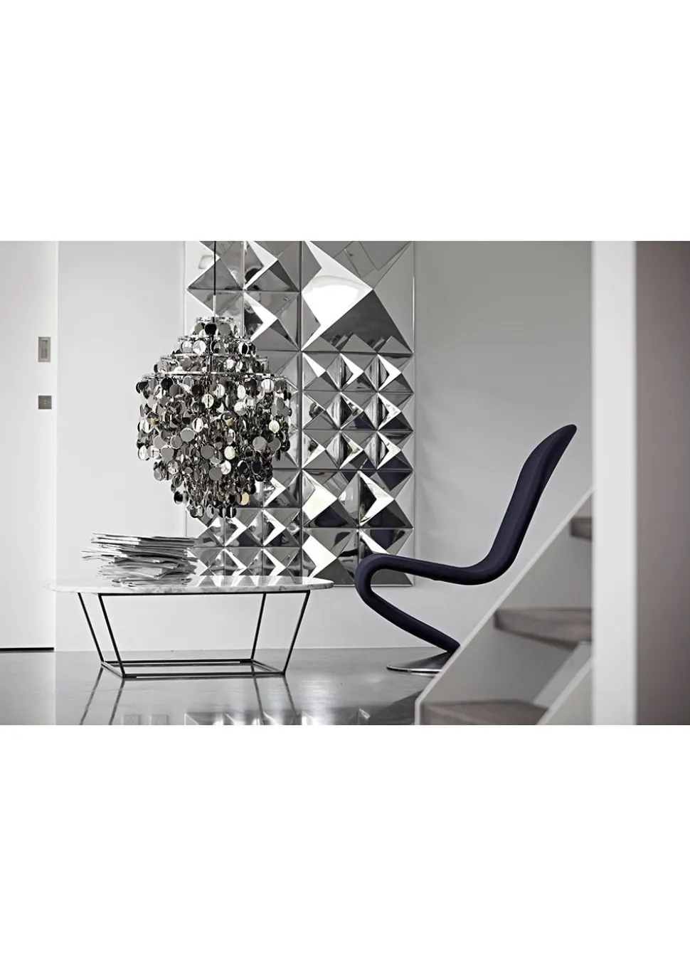 Mirror Sculptures wurde 1965 von entworfen. Die Wanddekoration ist mit einer, vier oder neun Pyramiden erhältlich.