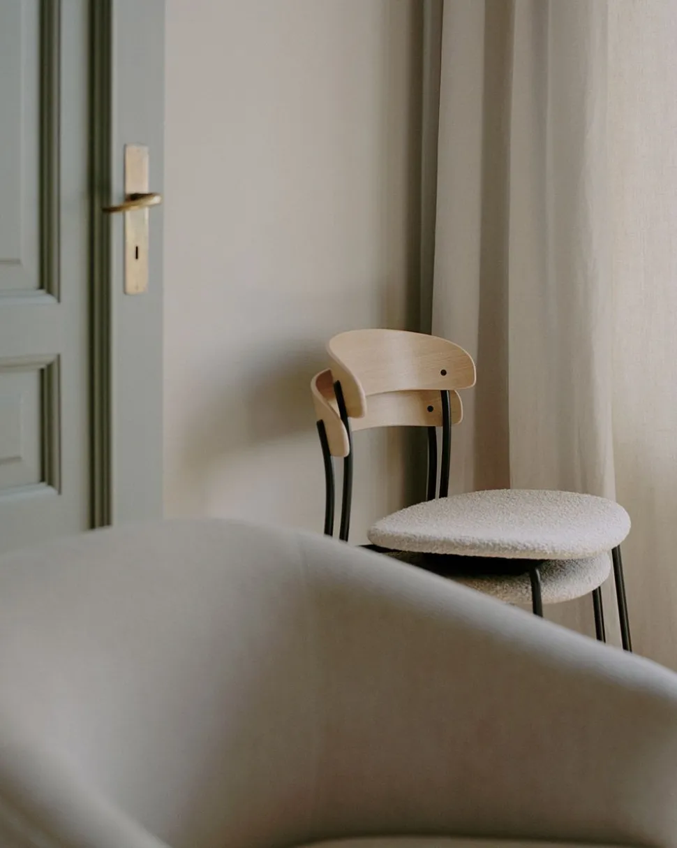 DerMissing Chair von , entworfen von Regular Company, ist eine nordische, minimalistische Interpretation der grundlegenden Funktionen des Stuhls, reduziert auf die einfachste und sauberste Version. Das Gestell des Stuhls besteht aus einem schlanken und diskreten Design, das die Sitzfläche und die Rückenlehne des Stuhls hervorhebt – zwei einfache Elemente in einem abgerundeten und weichen Design, das ergonomischen Komfort bietet.