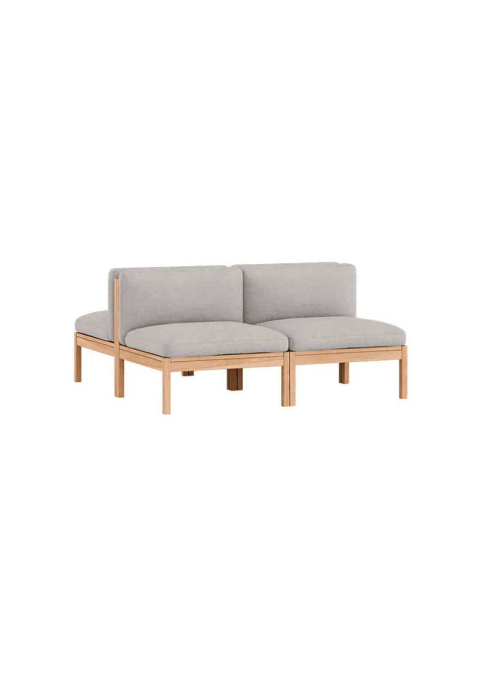 Mixed Combination A von ist ein modulares Sofa, das Funktionalität und Komfort in einem zeitlosen Design vereint. Das Gestell des Sofas besteht aus FSC-zertifiziertem Eichenholz und Eichenfurnier, das mit einer Hartölbehandlung versehen ist, die die natürliche Schönheit des Holzes schützt und betont. Die Befestigung erfolgt über ein innovatives Metallbügelsystem, mit dem sich sowohl einfache Sitzgelegenheiten als auch komplexe Anordnungen mit mehreren Winkeln realisieren lassen. Die Polsterung ist in einer Reihe von hochwertigen Stoffen des dänischen Textilherstellers Kvadrat erhältlich: Re-Wool 2, Field 2 und Autumn, die dem Sofa nicht nur ein stilvolles Aussehen, sondern auch ein verantwortungsvolles Umweltprofil verleihen.