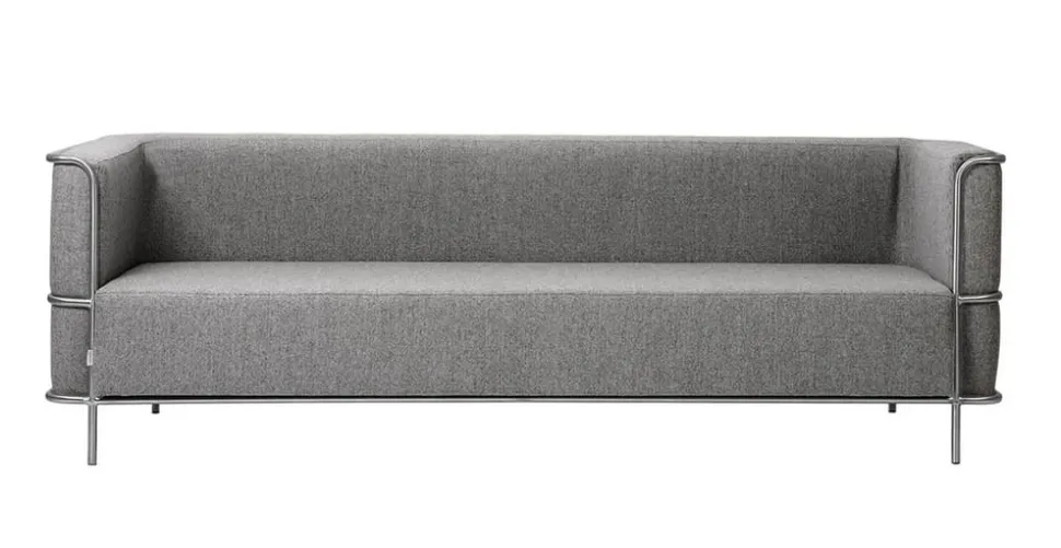 Dieses Modernist Sofa 3-Sitzer ist aus hochglanzpoliertem Stahl gefertigt. Das Sofa ist aus Wolle und Stahl gefertigt. Der Stahl des Sofas ist rostfrei.