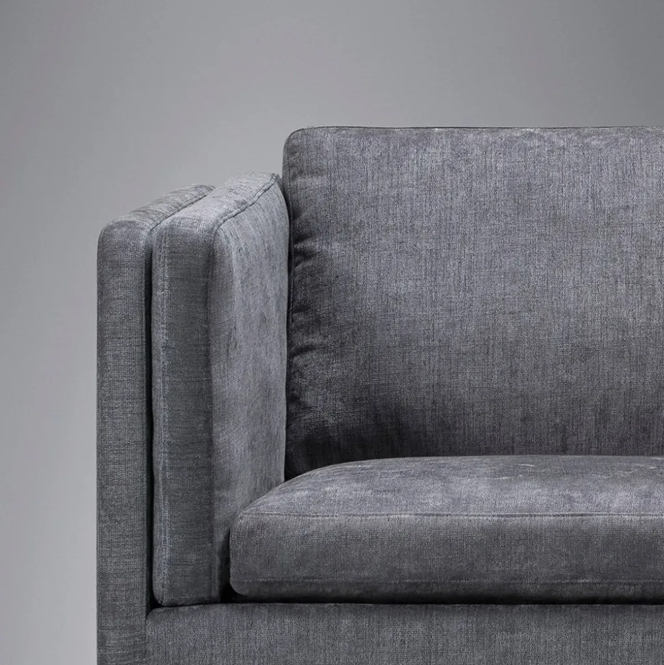 Die Schale des Sofas ist in einem kubistischen Design dicht gepolstert, wobei Armlehnen und Rückenlehne fließend ineinander übergehen. Die Kissen sind schlank und elegant, um das schlichte und nüchterne Design beizubehalten, ohne jedoch den Komfort zu beeinträchtigen. Sichtbare Paspeln entlang der Kanten heben das Möbelstück hervor und verleihen ihm ein noch schärferes Aussehen. Die Holzbeine heben das Sofa auf eine Höhe, die eine bequeme und komfortable Sitzhöhe bietet, ideal für eine gesellige Umgebung.