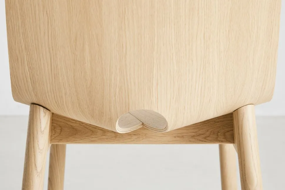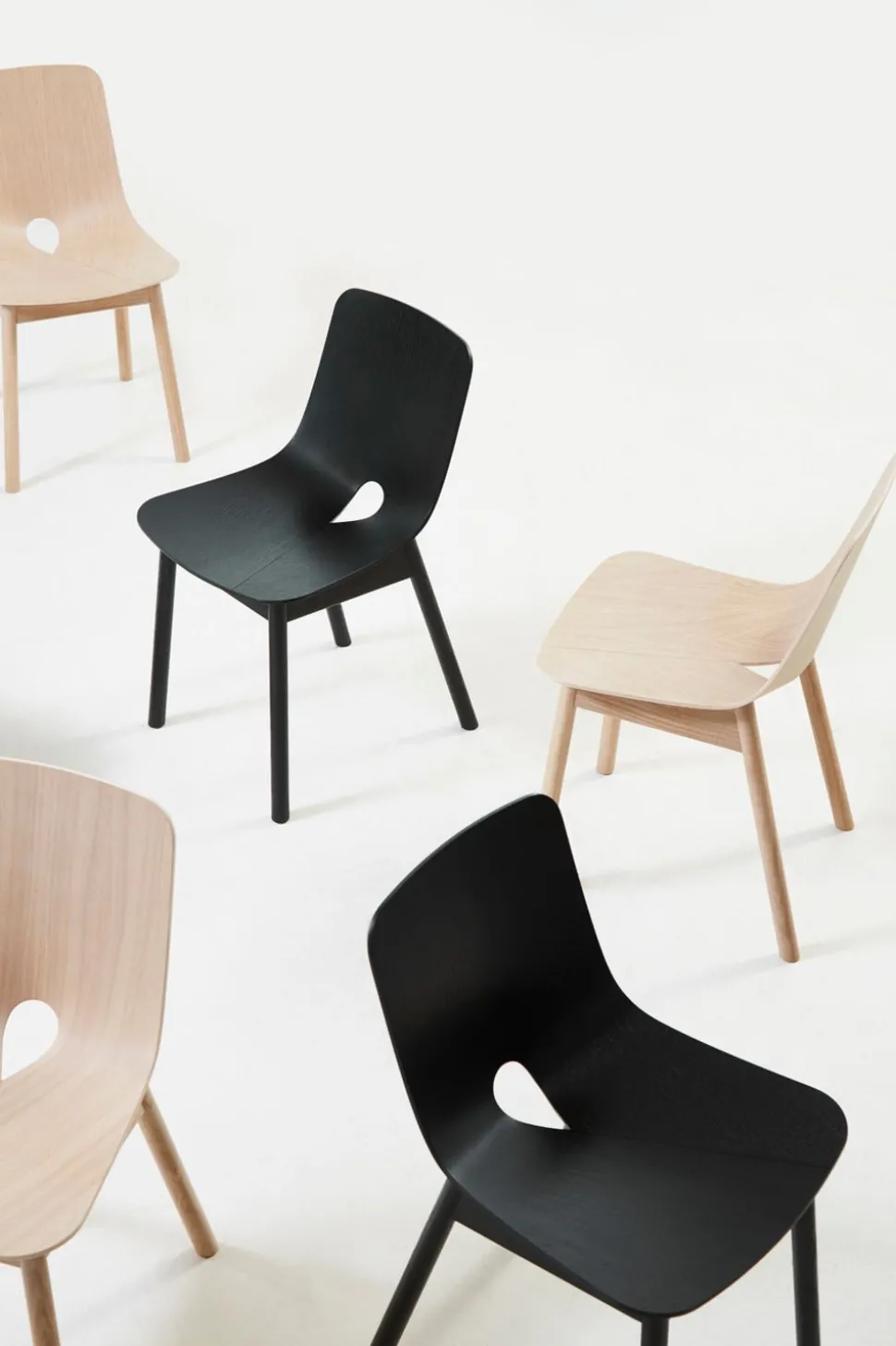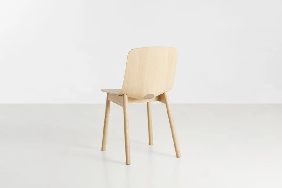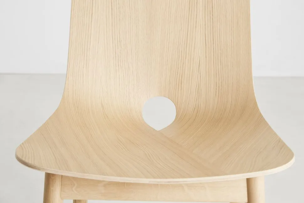 Mono Esszimmerstuhl von . Der schöne und elegante Stuhl ist Teil der Mono-Serie, die das Ergebnis eines untraditionellen Denkens ist. Die Mono-Serie hat ein anspruchsvolles, einfaches und klares Design, das sie zu etwas ganz Besonderem macht. Das unkonventionelle Denken kommt beim Mono voll zur Geltung. Das Design ist von der Idee inspiriert, Holz wie ein Stück Papier in eine Kegelform zu falten. Die Konstruktion aus Eichenfurnier verleiht der Serie einen leichten und raffinierten Look, der von der skandinavischen Designtradition inspiriert ist.