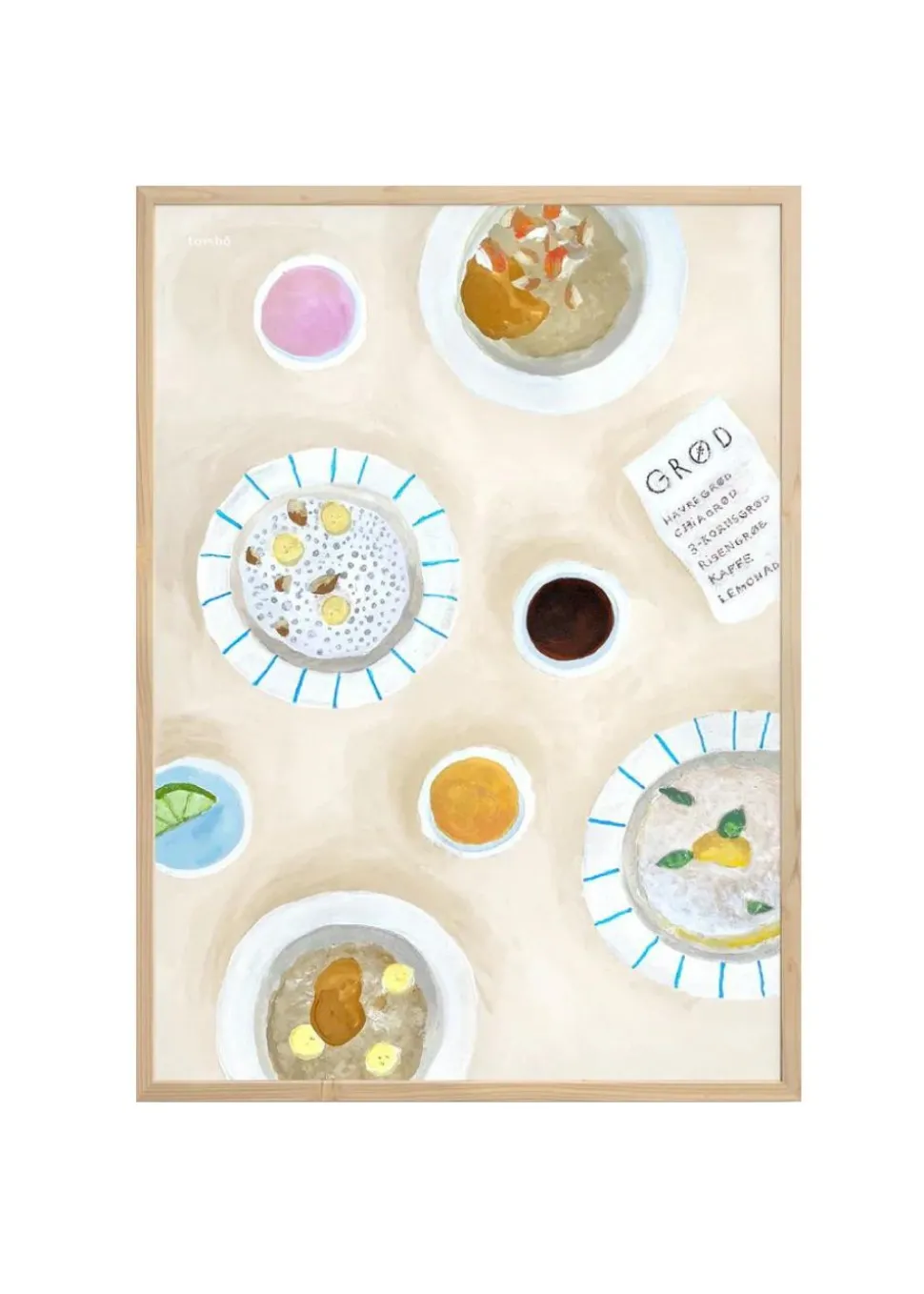 Das immer leckere Frühstück im Café GRØD besteht aus Haferflocken, Smotthiebals und Chia-Creme. Ihr breites Angebot an schönen und schmackhaften Frühstücksgerichten ist in Dänemark ein Hit. Das Poster „Morning table at GRØD“ von illustriert den köstlichen GRØD-Tisch perfekt. Es ist ein lustiges und schönes Plakat, bei dem man die weichen Pinselstriche sehen und die Atmosphäre spüren kann.