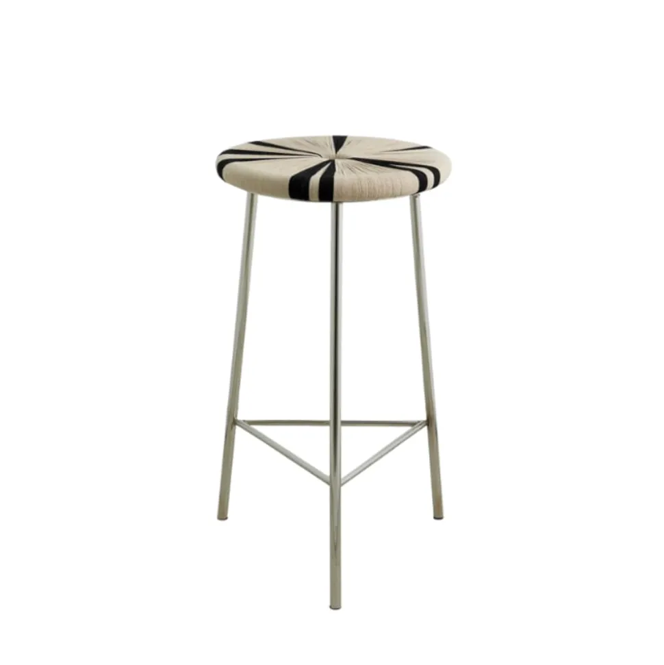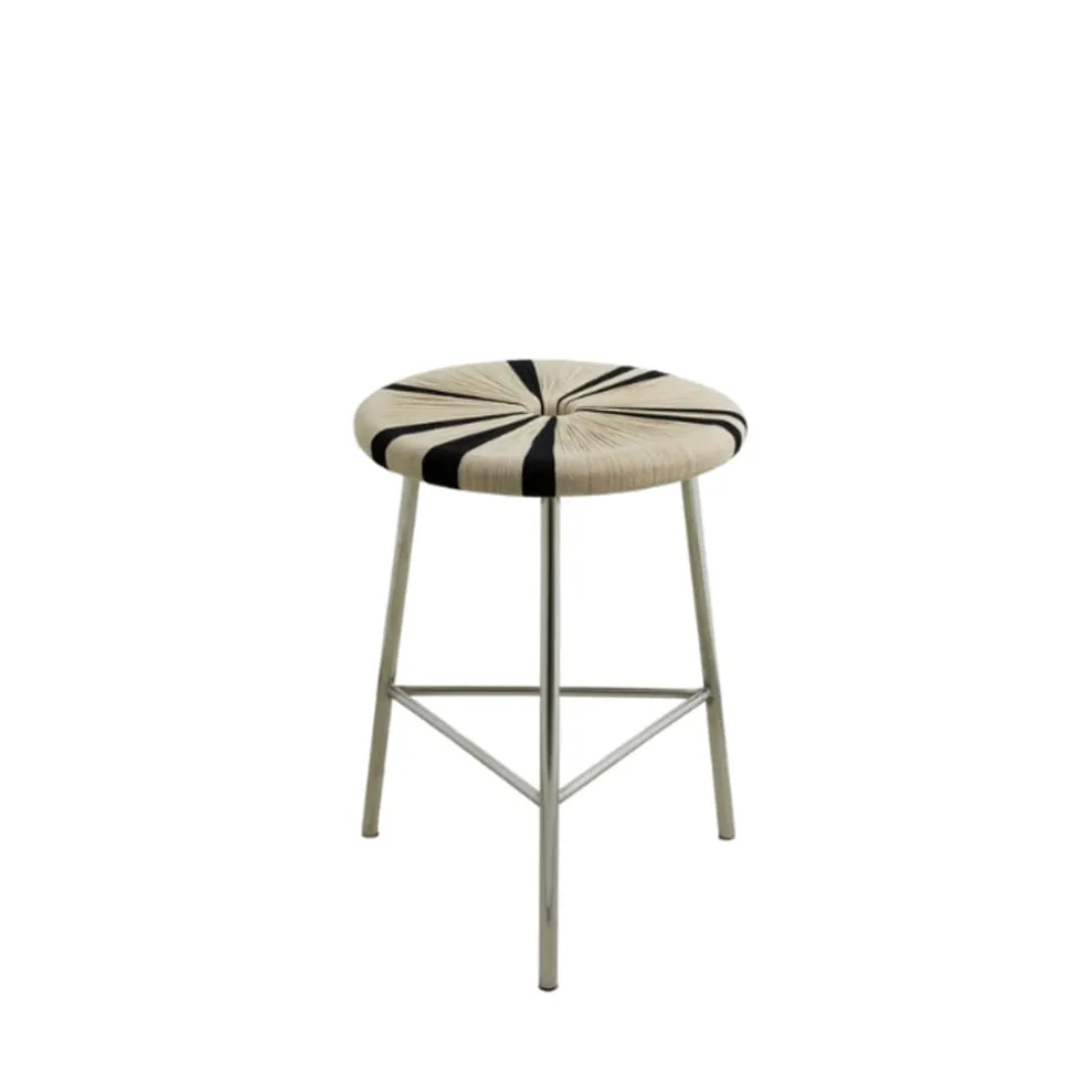 Der Morice Hocker von verbindet raue Eleganz mit modernem Design. Die handgeflochtene Sitzfläche in Naturtönen schafft einen dynamischen Ausdruck, bei dem die grafischen Streifen einen künstlerischen Akzent setzen. Das Gestell aus glänzendem Chrom bildet einen raffinierten Kontrast, der das Gleichgewicht zwischen industriell und organisch herstellt und einen leichten und luftigen Look erzeugt.