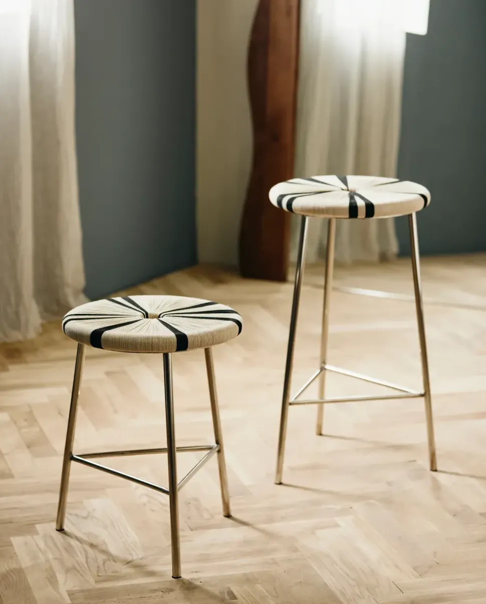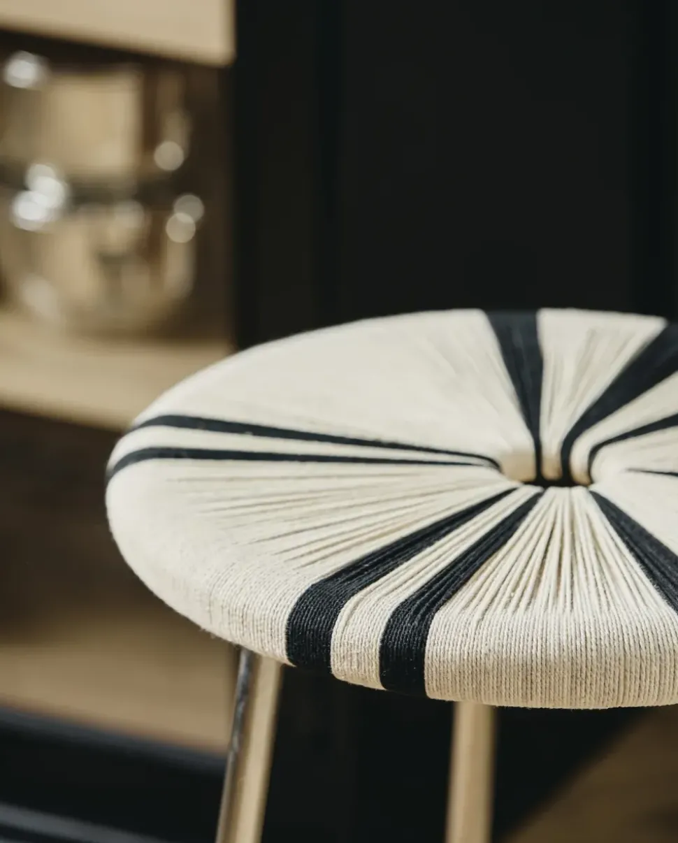 Der vielseitige Hocker kann als stilvolles Element an der Kücheninsel, als zusätzliche Sitzgelegenheit oder als dekoratives Element im Raum dienen. Er passt sowohl zu minimalistischen als auch zu eklektischen Interieurs, in denen Handwerkskunst und Moderne miteinander verschmelzen.